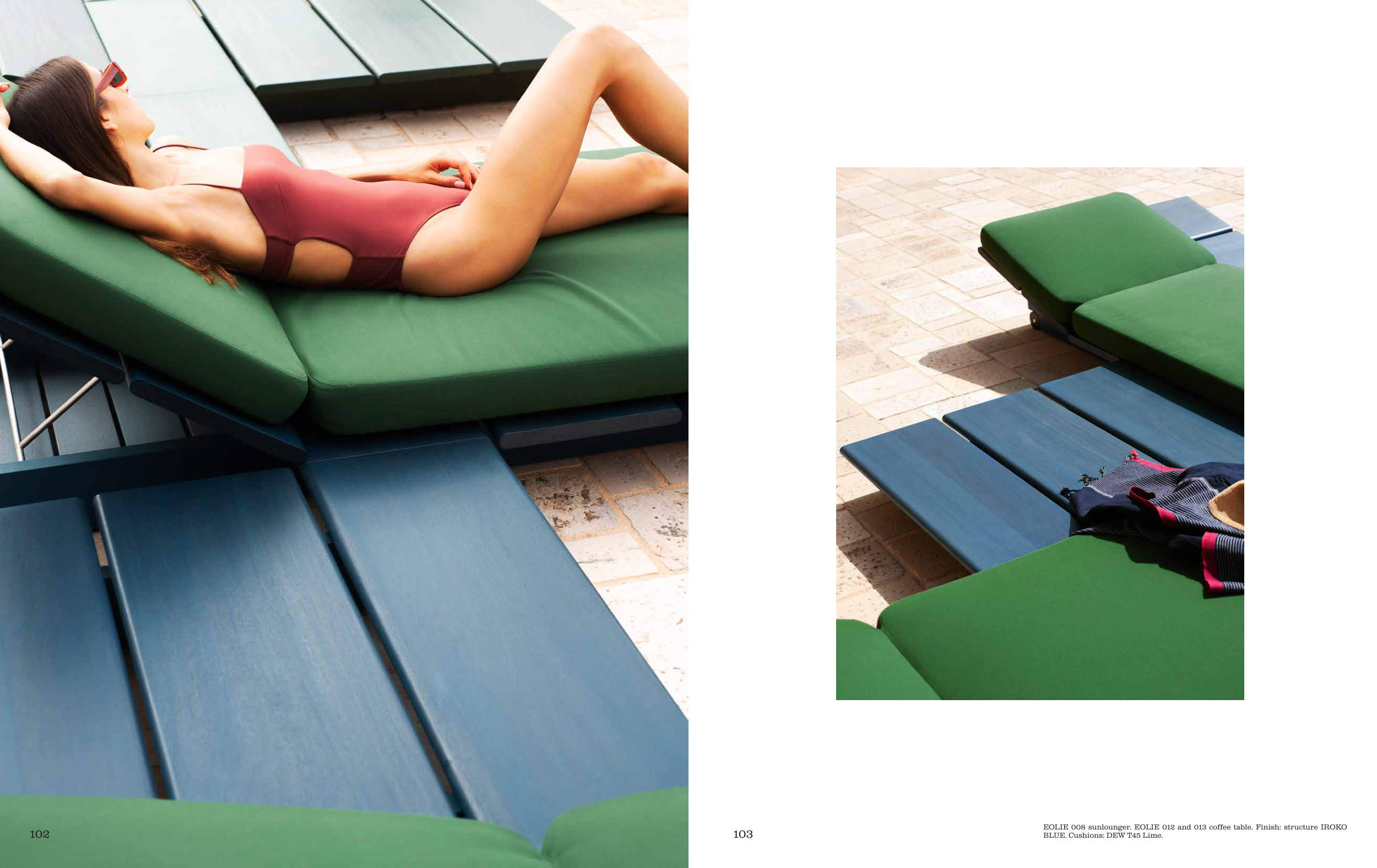 EOLIE 008 sunlounger. EOLIE 012 and 013 coffee table. Finish: structure IROKO