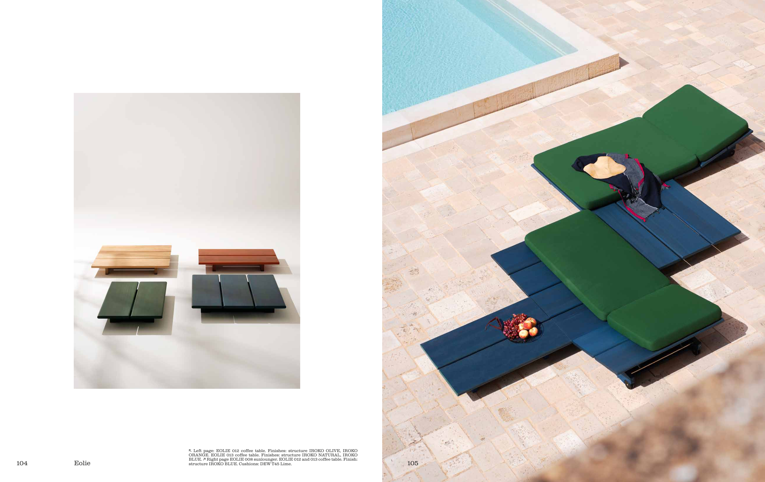 BLUE. ↗ Right page EOLIE 008 sunlounger. EOLIE 012 and 013 coffee table. Finish: