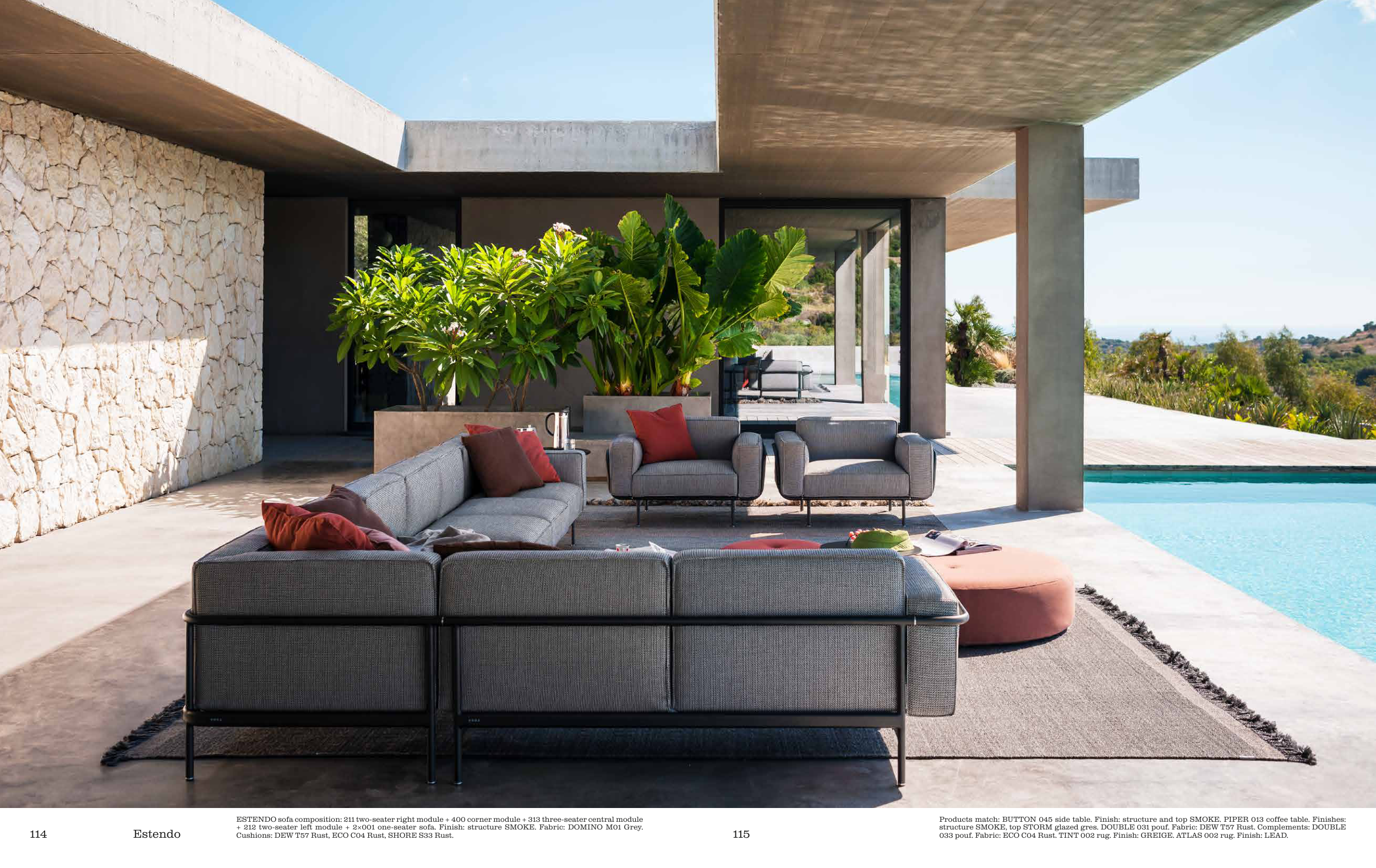structure SMOKE, top STORM glazed gres. DOUBLE 031 pouf. Fabric: DEW T57 Rust. Complements: DOUBLE