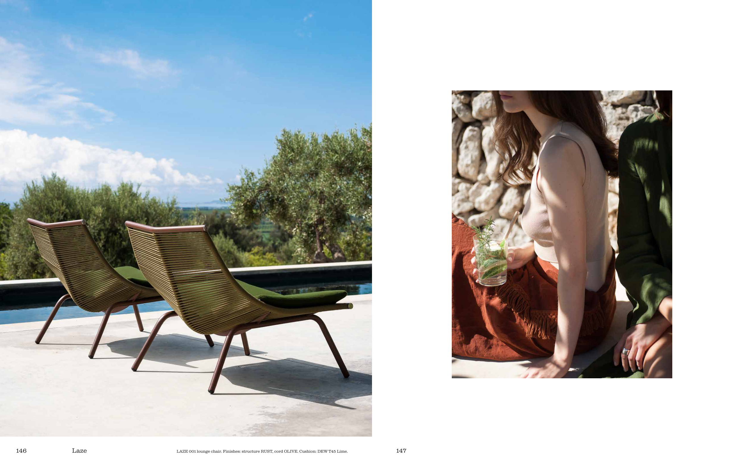 LAZE 001 lounge chair. Finishes: structure RUST, cord OLIVE. Cushion: DEW T45 Lime.