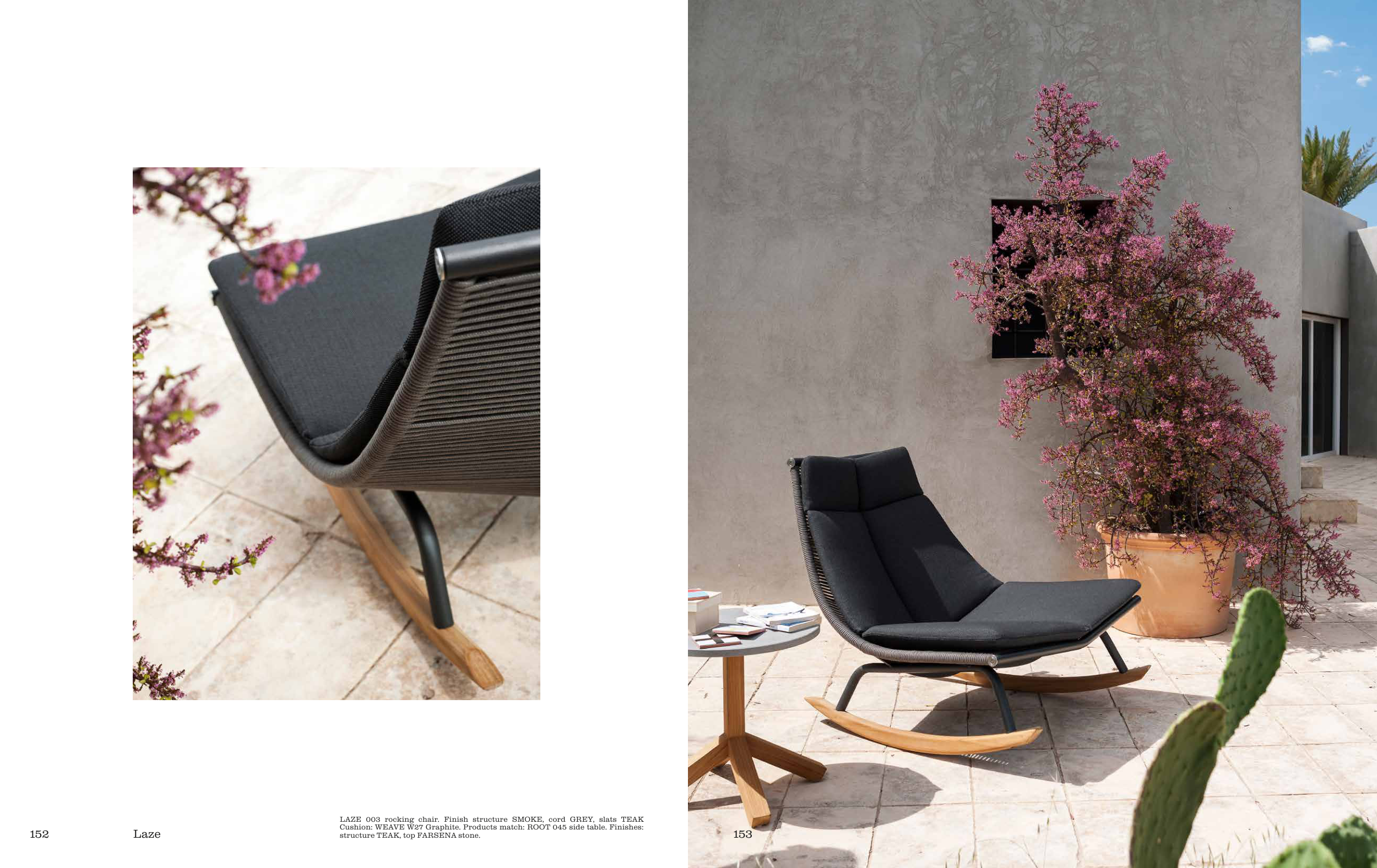LAZE 003 rocking chair. Finish structure SMOKE, cord GREY, slats TEAK