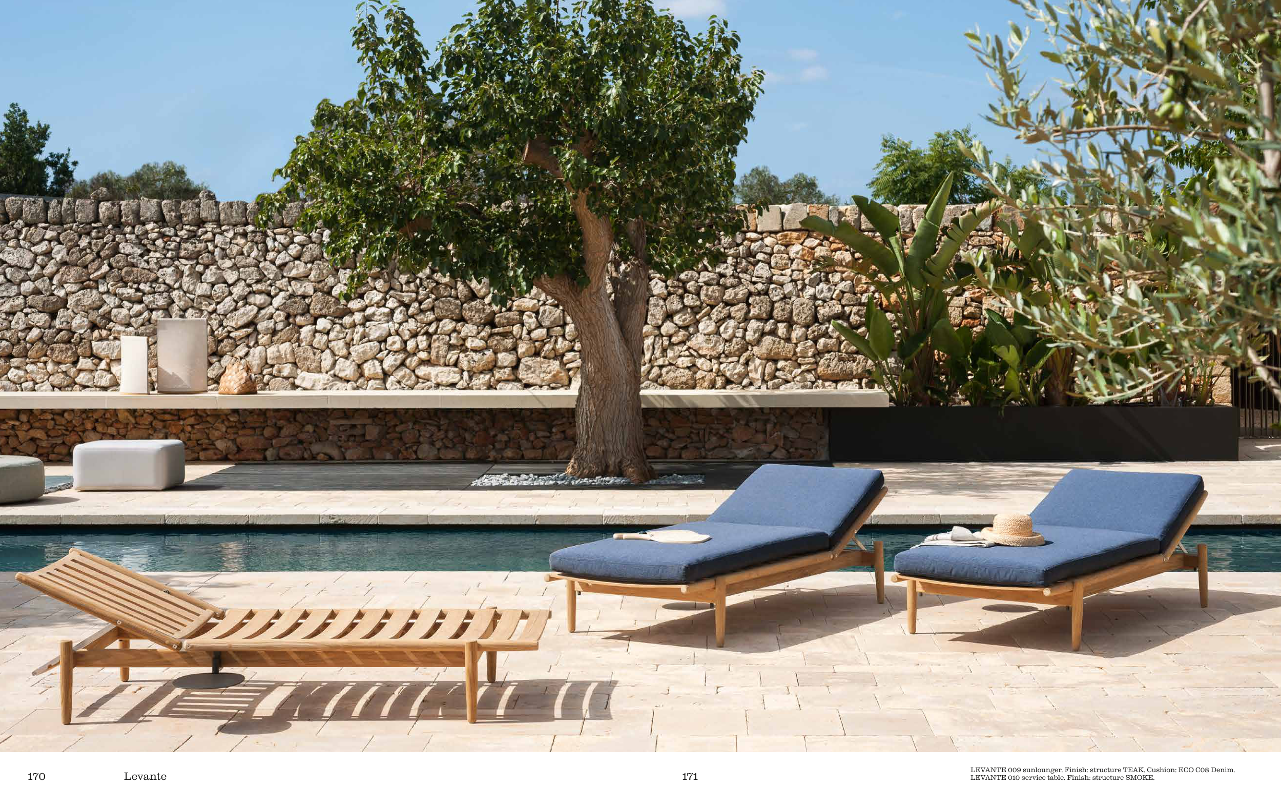 LEVANTE 009 sunlounger. Finish: structure TEAK. Cushion: ECO C08 Denim.