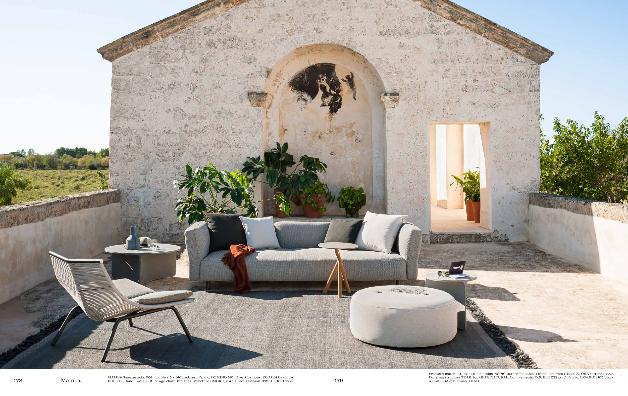 Finishes: structure TEAK, top GRES NATURAL. Complements: DOUBLE 032 pouf. Fabric: OXFORD G05 Black.
