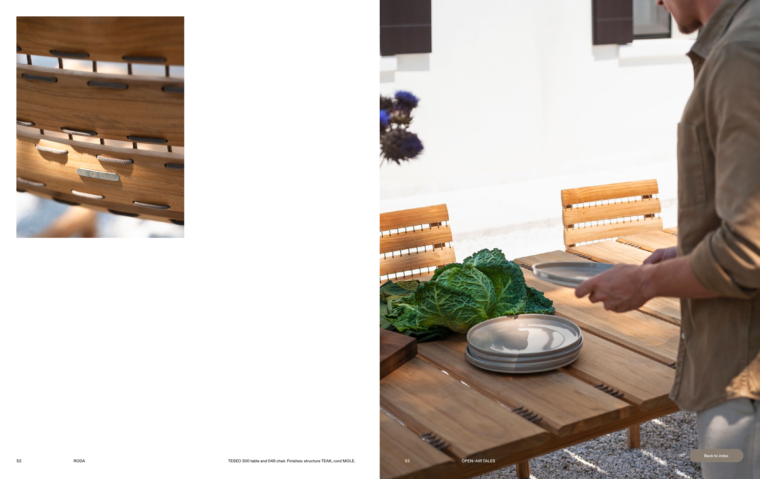 TESEO 300 table and 049 chair. Finishes: structure TEAK, cord MOLE.