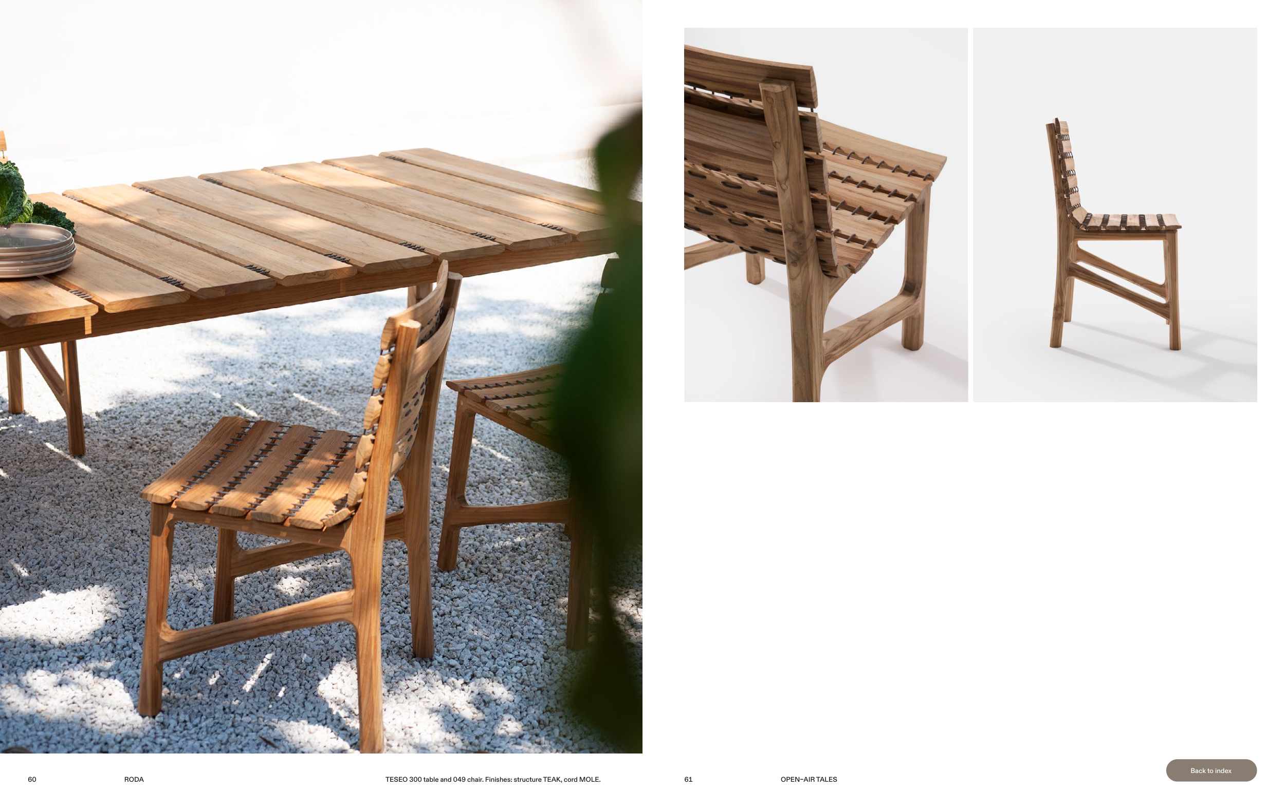 TESEO 300 table and 049 chair. Finishes: structure TEAK, cord MOLE.
