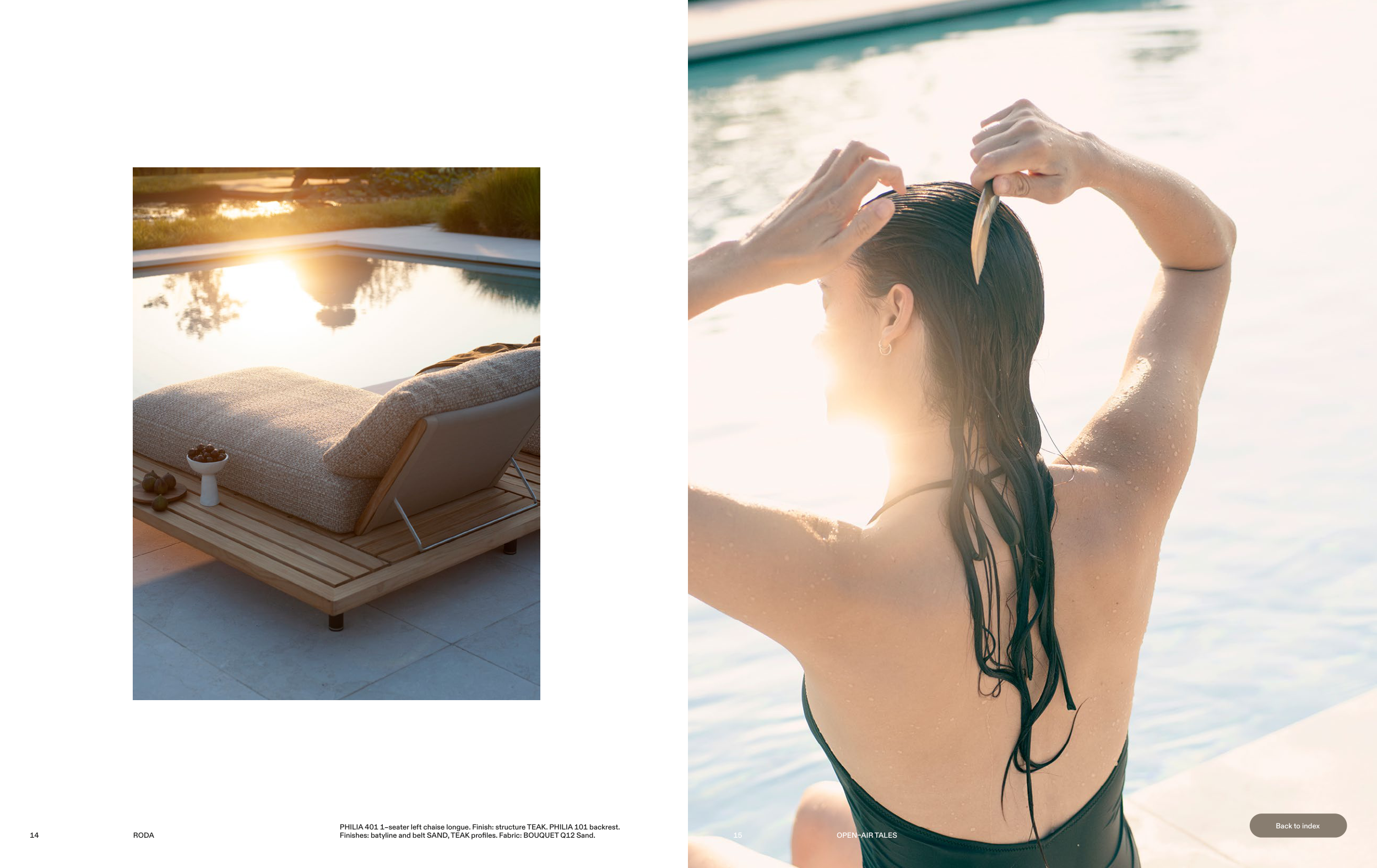 PHILIA 401 1–seater left chaise longue. Finish: structure TEAK. PHILIA 101 backrest.