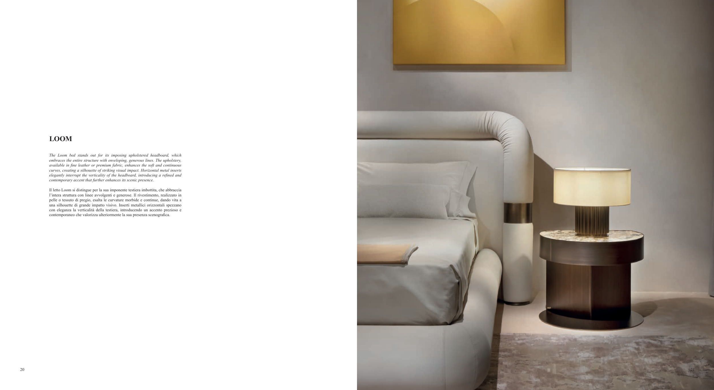 Il letto Loom si distingue per la sua imponente testiera imbottita, che abbraccia