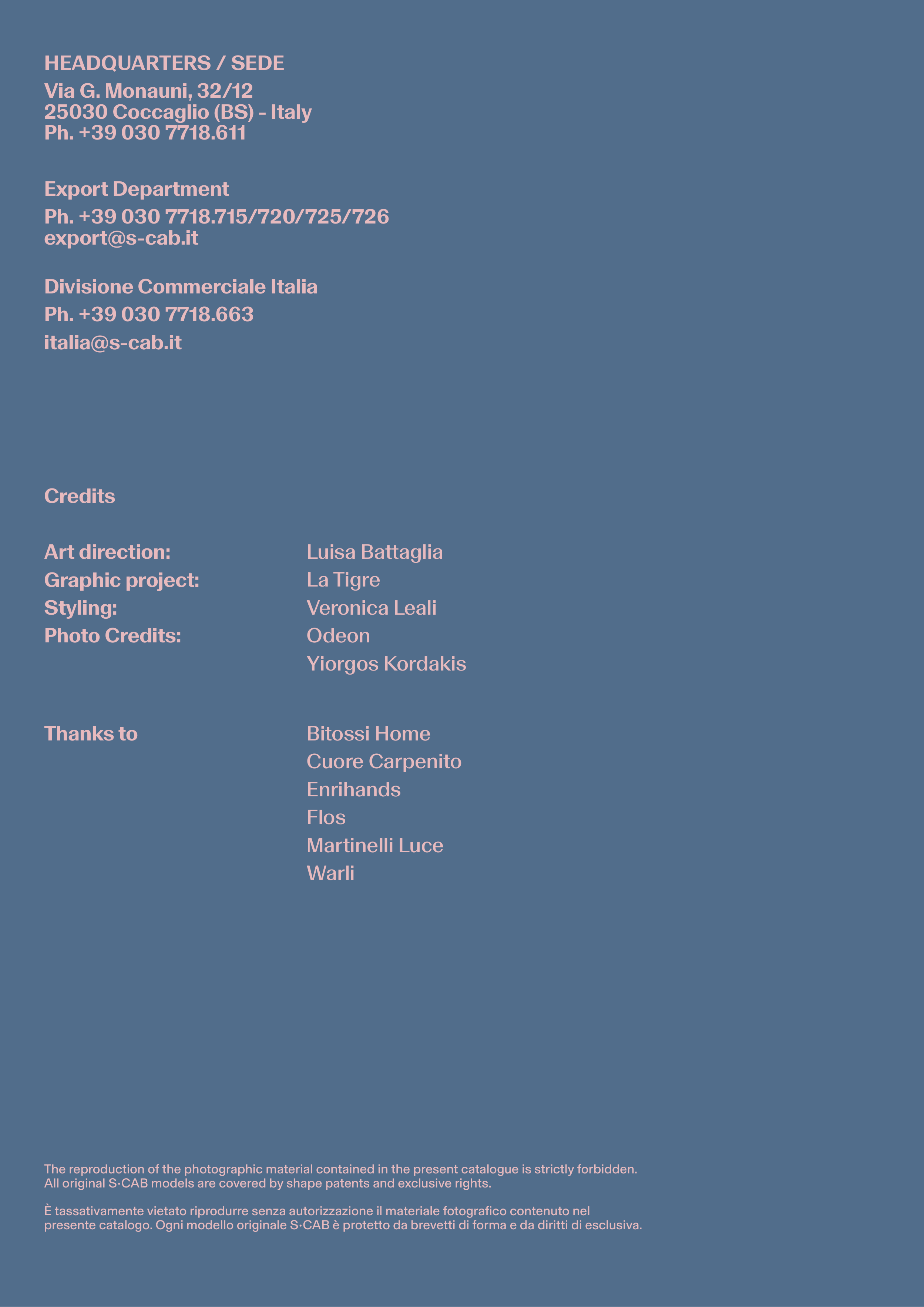 presente catalogo. Ogni modello originale S•CAB è protetto da brevetti di forma e da diritti di esclusiva.