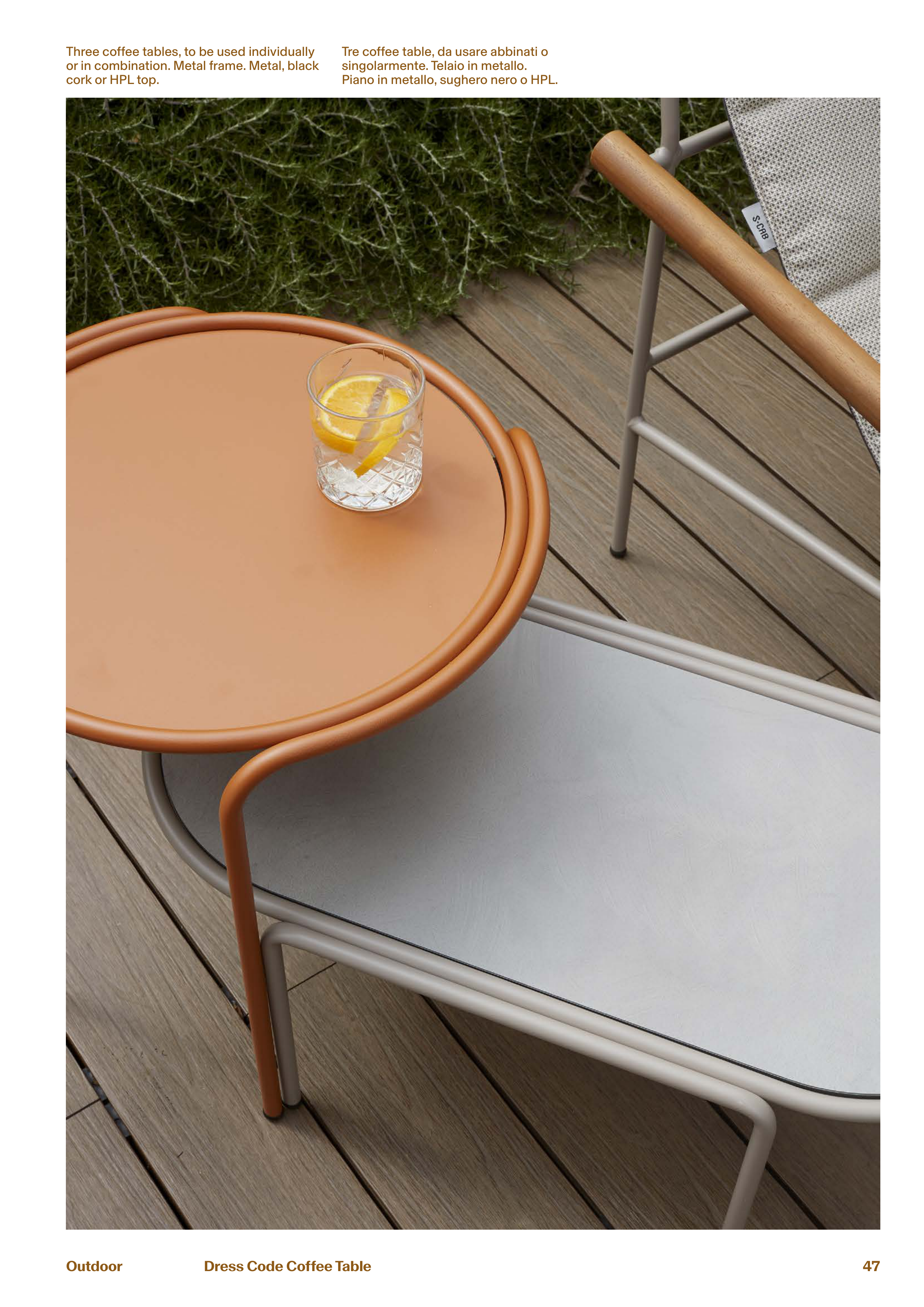 Outdoor 47 Dress Code Coffee Table Three coffee tables, to be used individually or in combination. Metal frame. Metal, black cork or HPL top. Tre coffee table, da usare abbinati o singolarmente. Telaio in metallo. Piano in metallo, sughero nero o HPL.