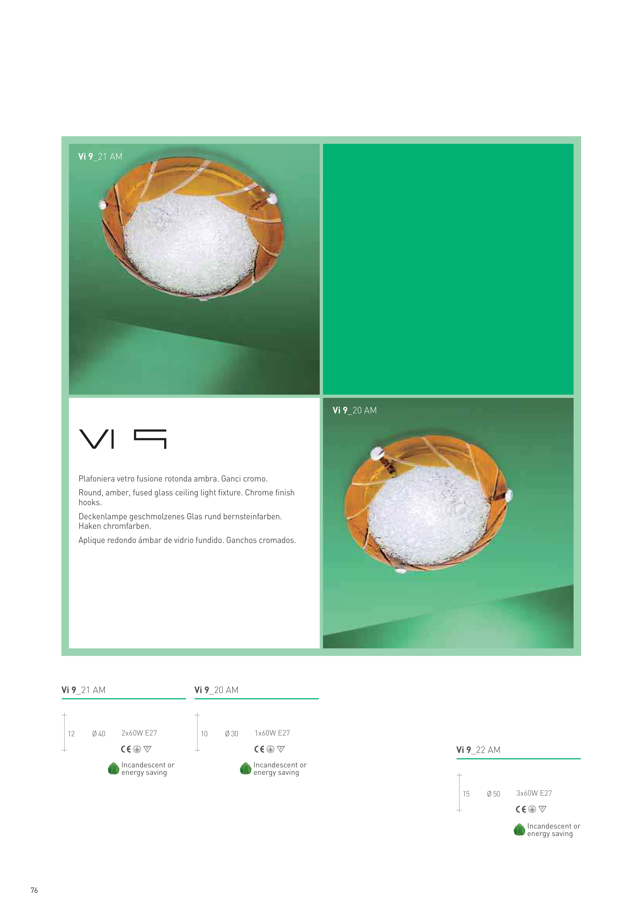 Plafoniera vetro fusione rotonda ambra. Ganci cromo.