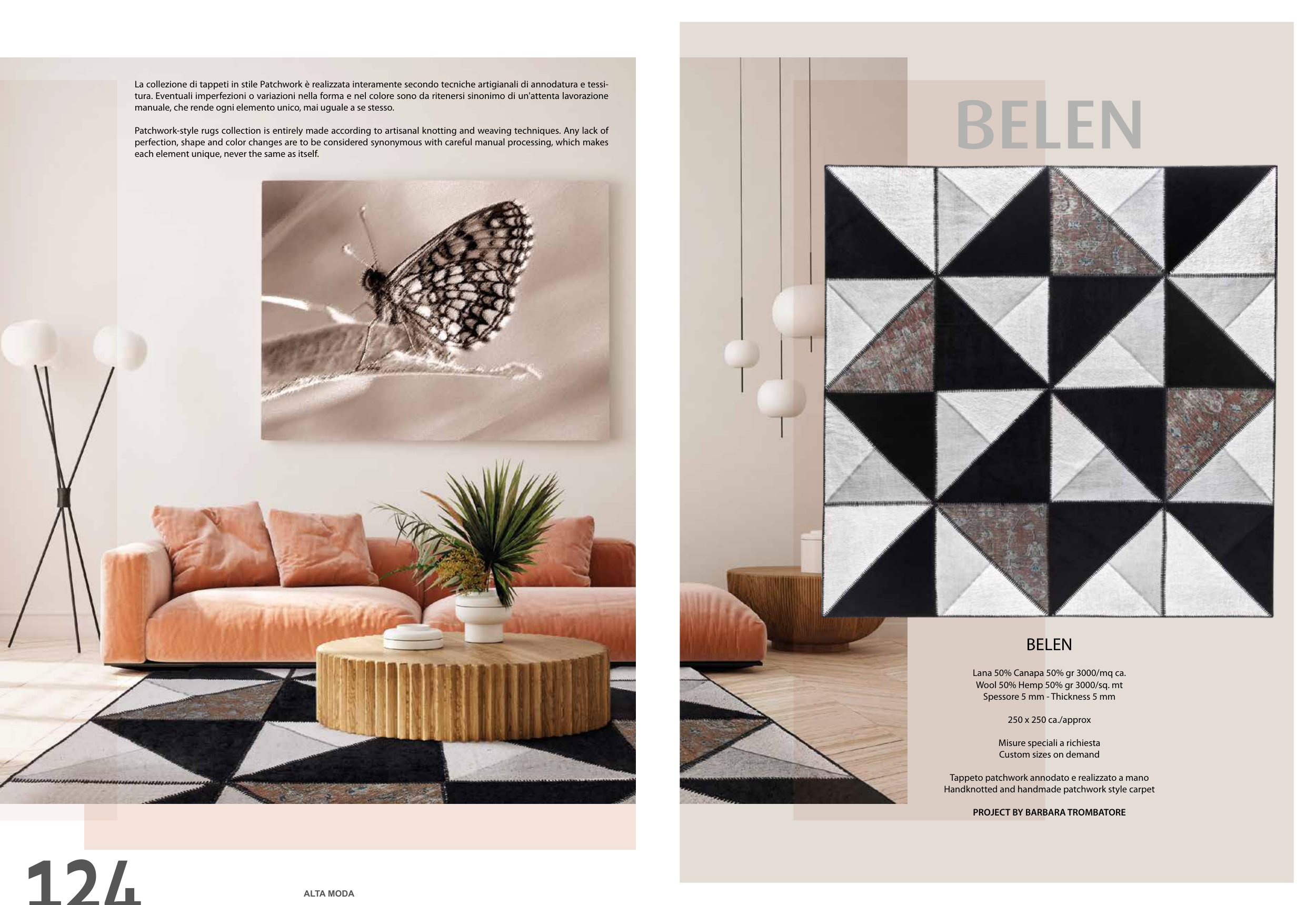 La collezione di tappeti in stile Patchwork è realizzata interamente secondo tecniche artigianali di annodatura e tessi-