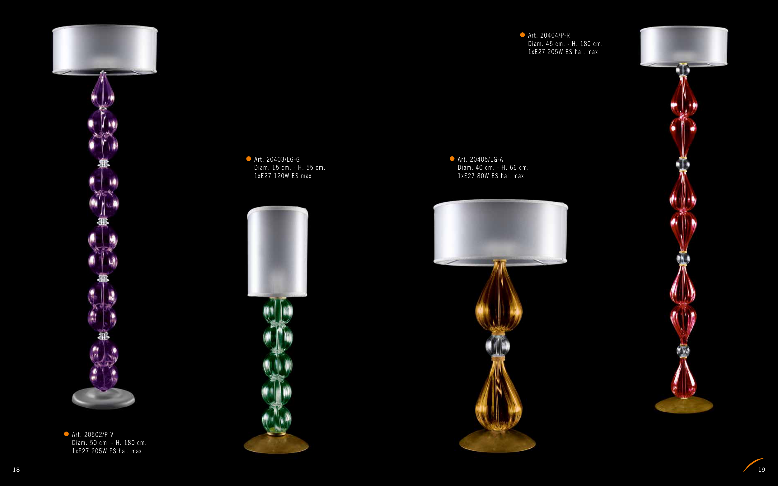 Art. 20502/P-V Diam. 50 cm. - H. 180 cm. 1xE27 205W ES hal. max Art. 20404/P-R Diam. 45 cm. - H. 180 cm. 1xE27 205W ES hal. max Art. 20403/LG-G Diam. 15 cm. - H. 55 cm. 1xE27 120W ES max Art. 20405/LG-A Diam. 40 cm. - H. 66 cm. 1xE27 80W ES hal. max 18 19