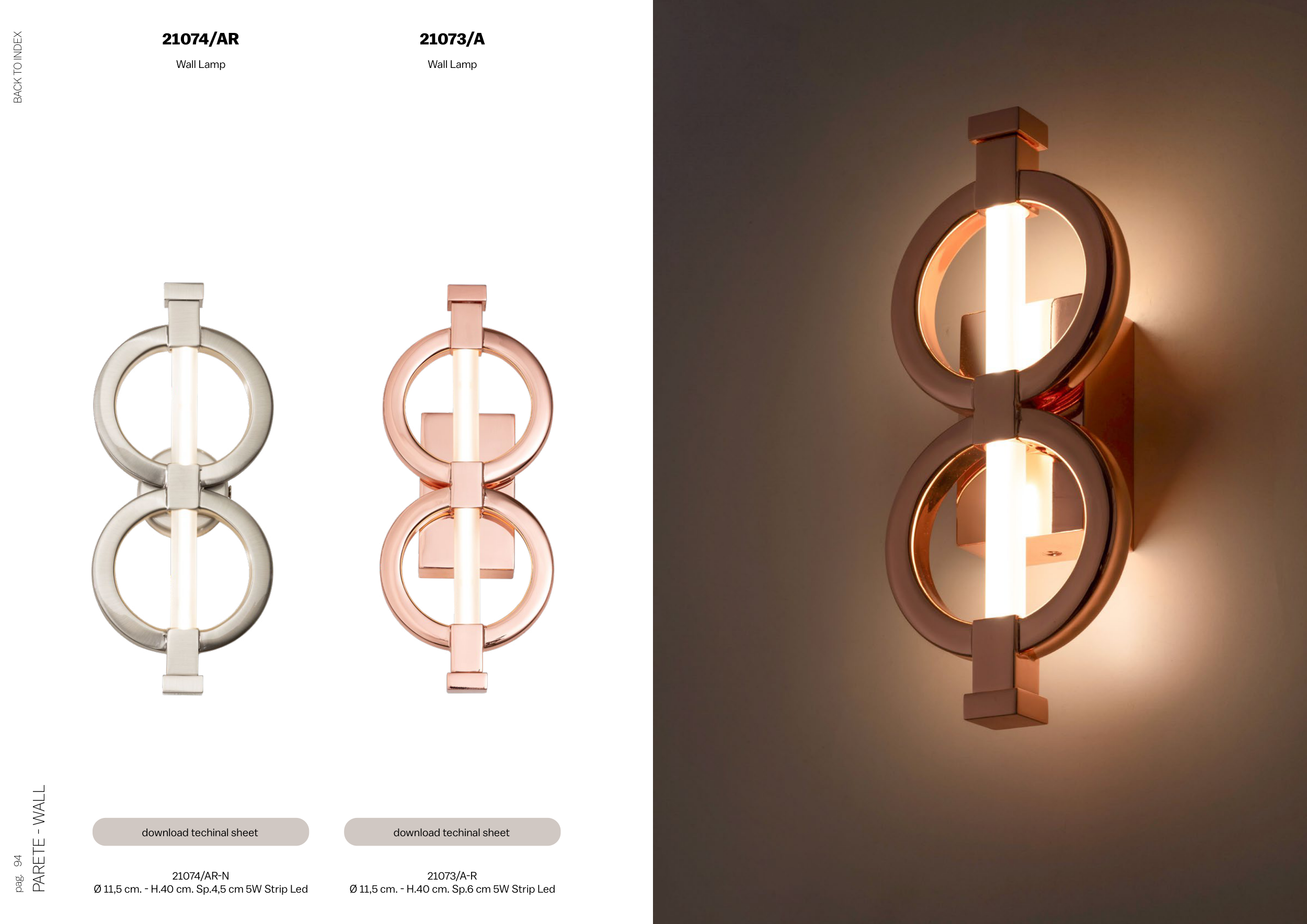 PARETE - WALL PARETE - WALL pag. pag. 94 95 BACK TO INDEX BACK TO INDEX 21074/AR-N Ø 11,5 cm. - H.40 cm. Sp.4,5 cm 5W Strip Led Wall Lamp 21074/AR 21073/A-R Ø 11,5 cm. - H.40 cm. Sp.6 cm 5W Strip Led Wall Lamp 21073/A download techinal sheet download techinal sheet