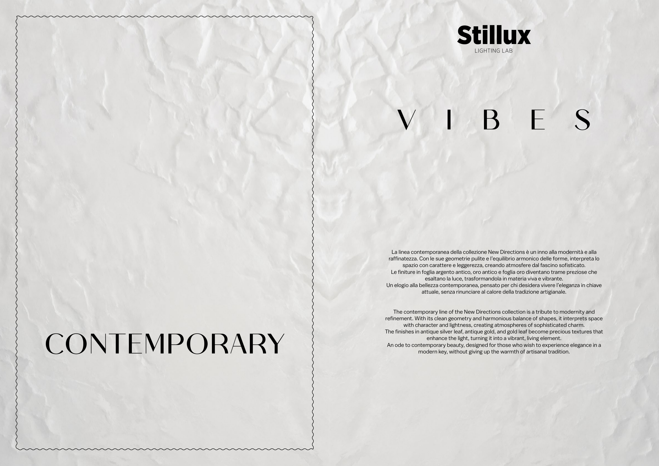 The finishes in antique silver leaf, antique gold, and gold leaf become precious textures that