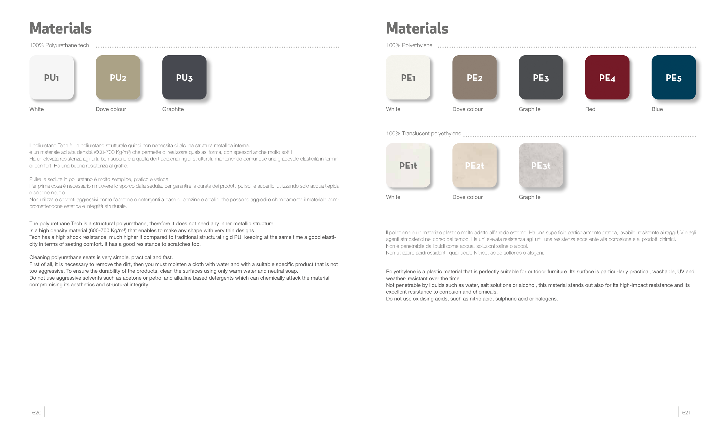 Polyethylene is a plastic material that is perfectly suitable for outdoor furniture. Its surface is particu-larly practical, washable, UV and