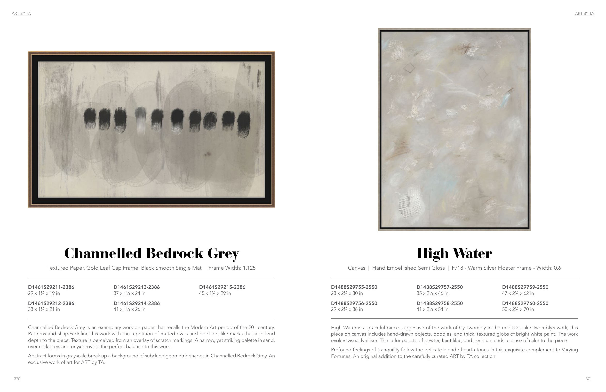 Abstract forms in grayscale break up a background of subdued geometric shapes in Channelled Bedrock Grey. An