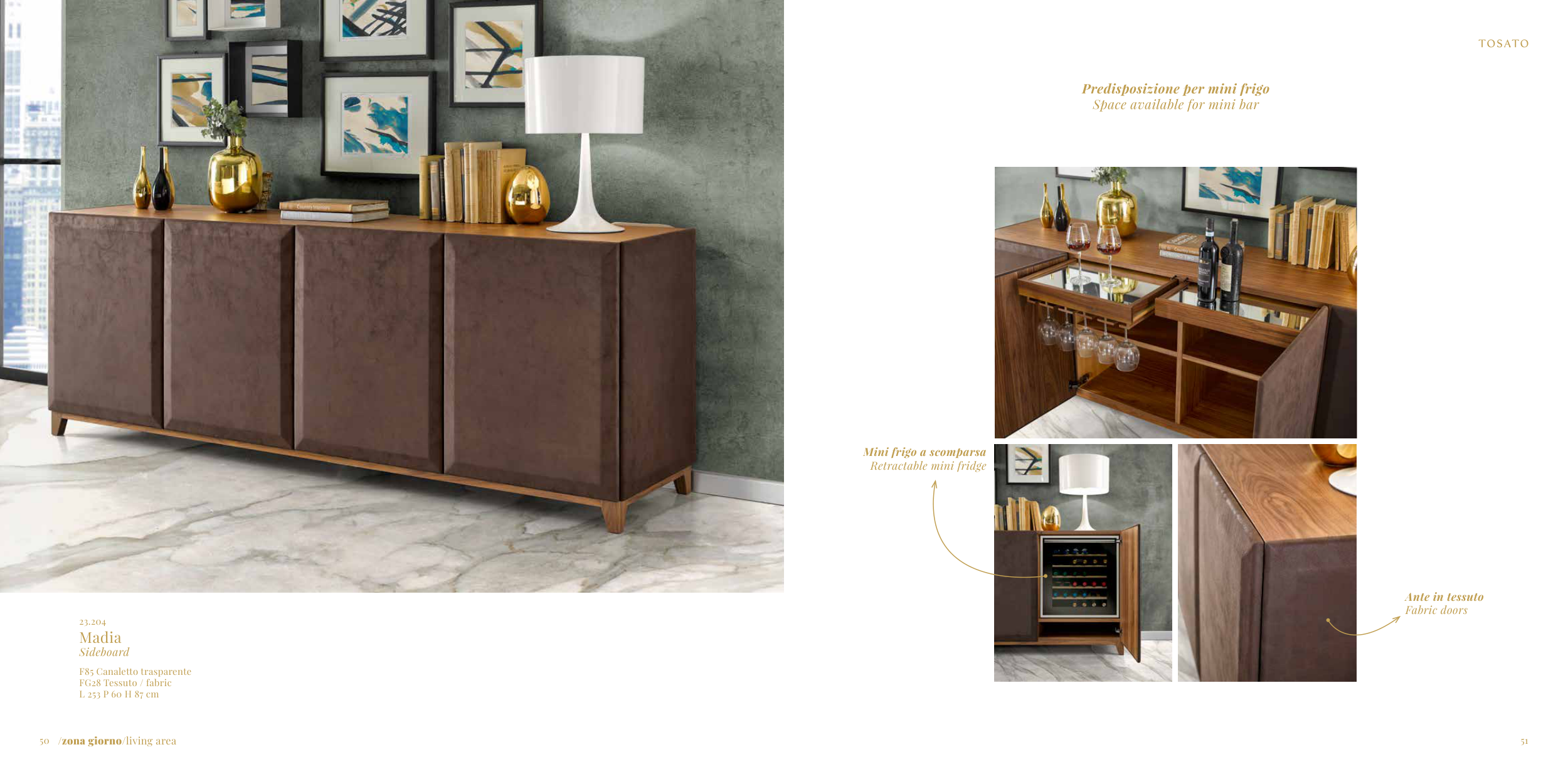 50 51 23.204 Madia Sideboard F85 Canaletto trasparente FG28 Tessuto / fabric L 253 P 60 H 87 cm /zona giorno/living area Mini frigo a scomparsa Retractable mini fridge Ante in tessuto Fabric doors Predisposizione per mini frigo Space available for mini bar