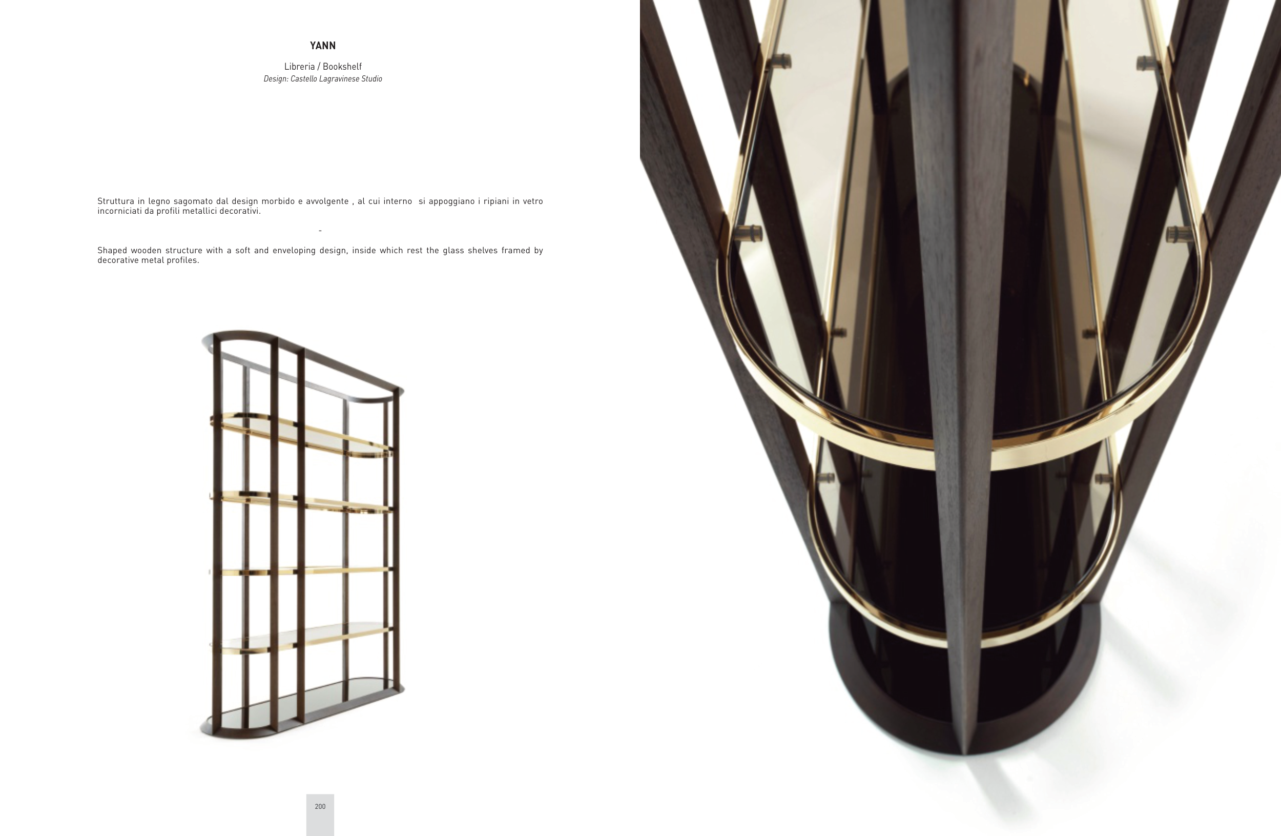 Struttura in legno sagomato dal design morbido e avvolgente , al cui interno si appoggiano i ripiani in vetro
