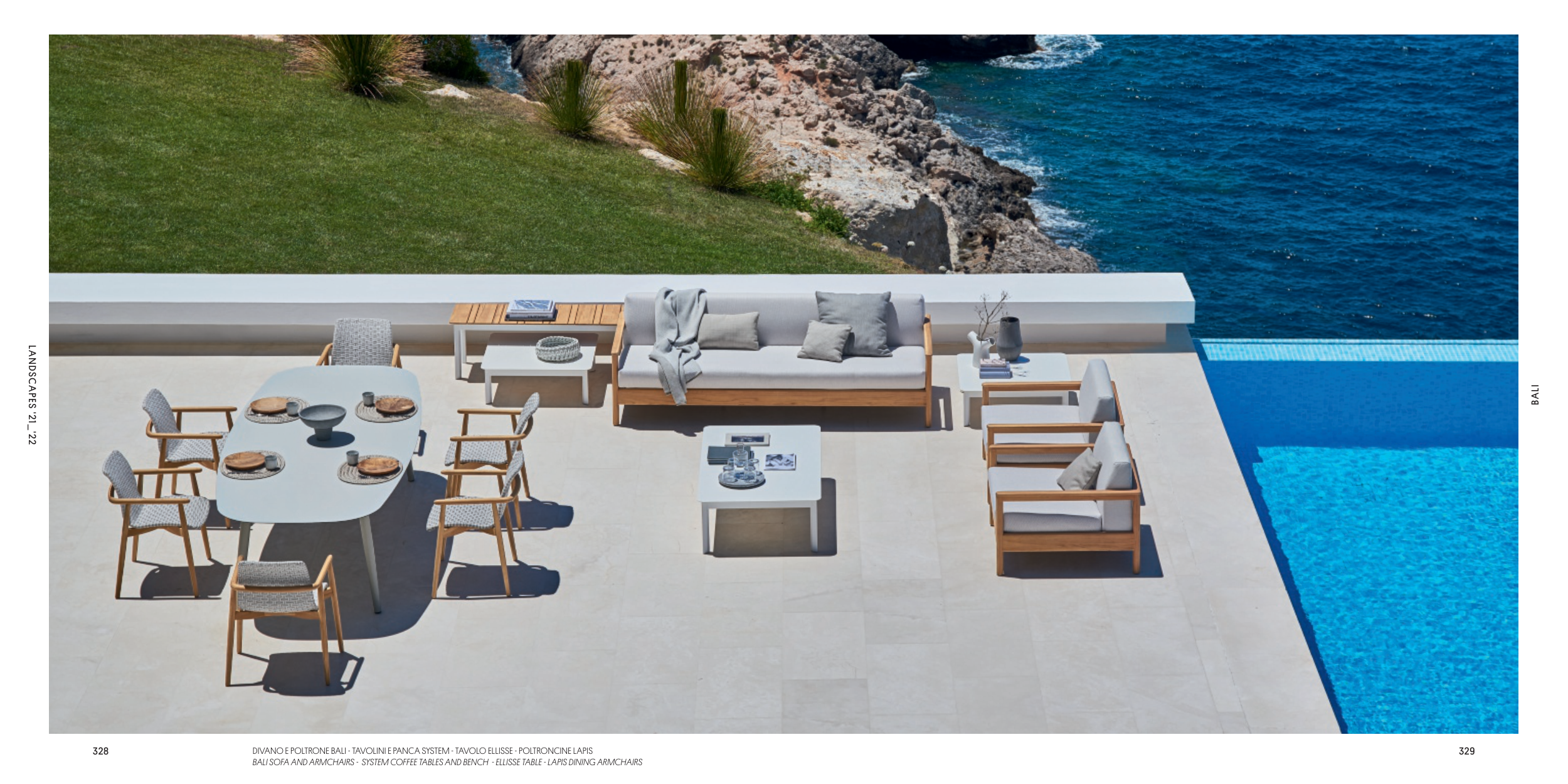 BALI SOFA AND ARMCHAIRS - SYSTEM COFFEE TABLES AND BENCH - ELLISSE TABLE - LAPIS DINING ARMCHAIRS