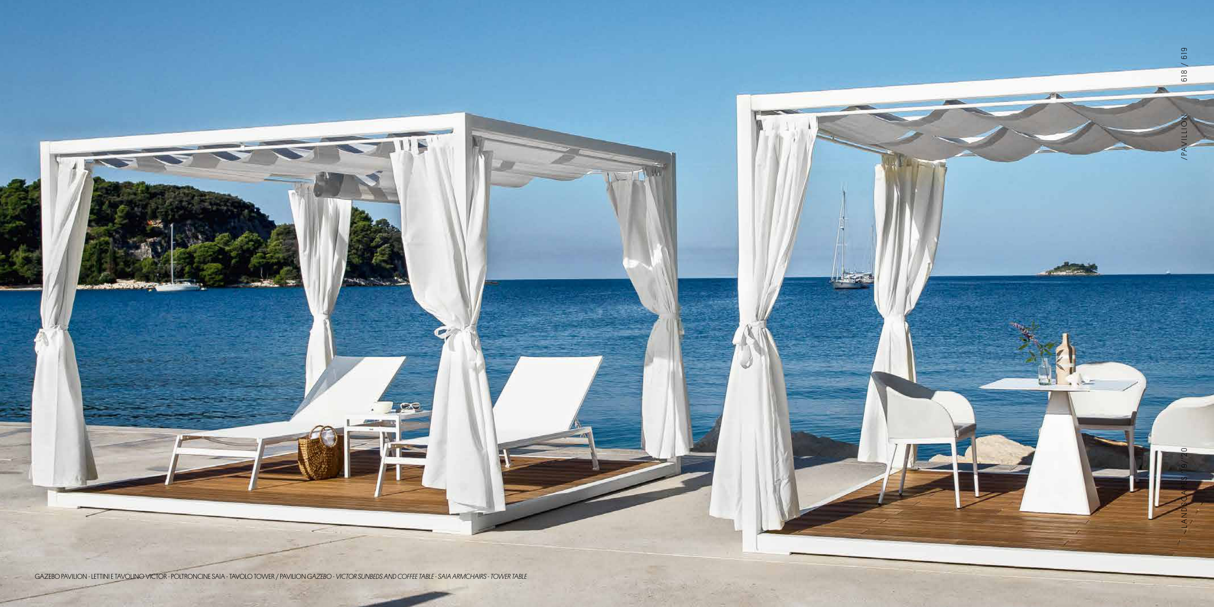 GAZEBO PAVILION - LETTINI E TAVOLINO VICTOR - POLTRONCINE SAIA - TAVOLO TOWER / PAVILION GAZEBO - VICTOR SUNBEDS AND COFFEE TABLE - SAIA ARMCHAIRS - TOWER TABLE