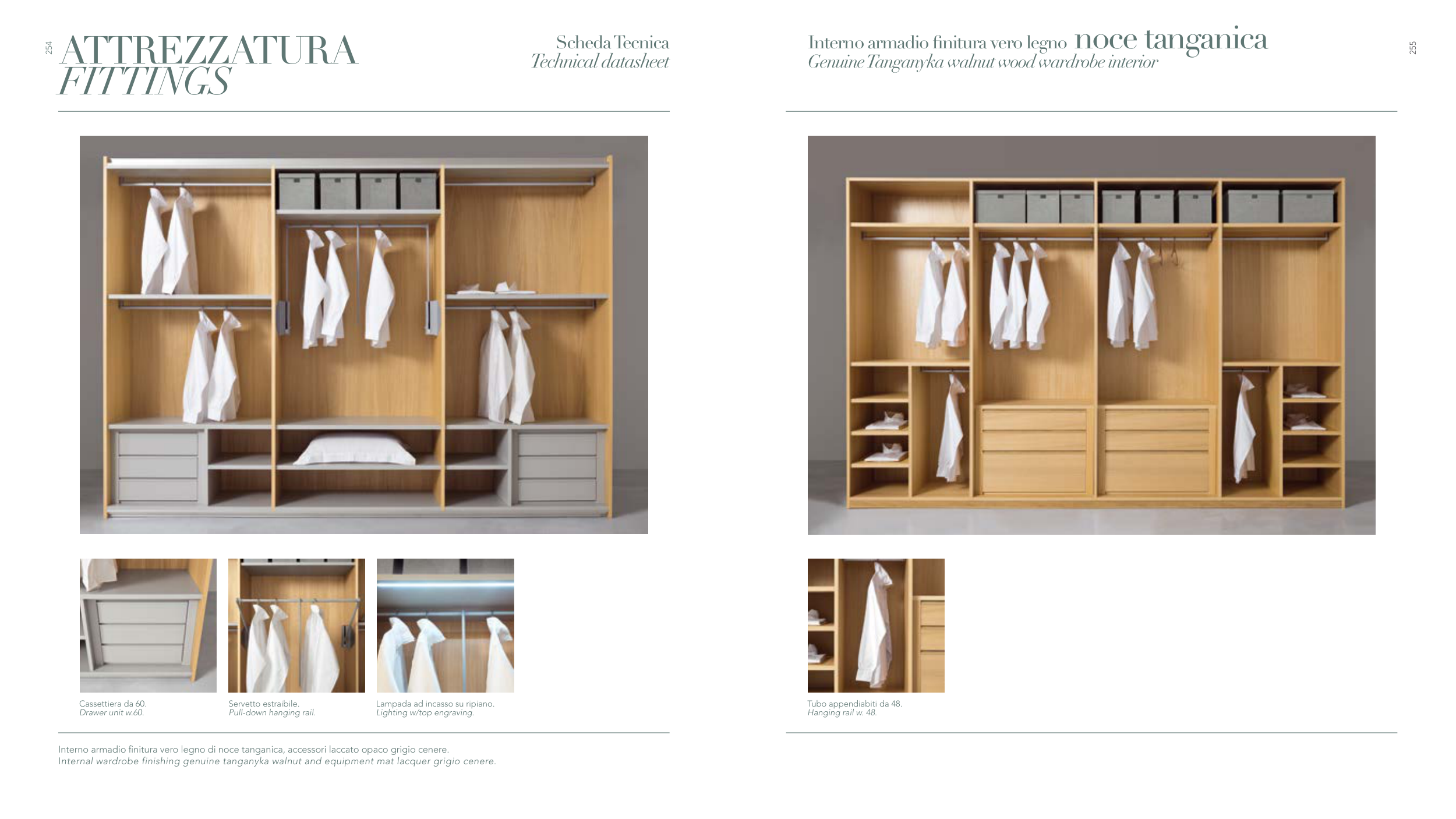 Internal wardrobe finishing genuine tanganyka walnut and equipment mat lacquer grigio cenere.
