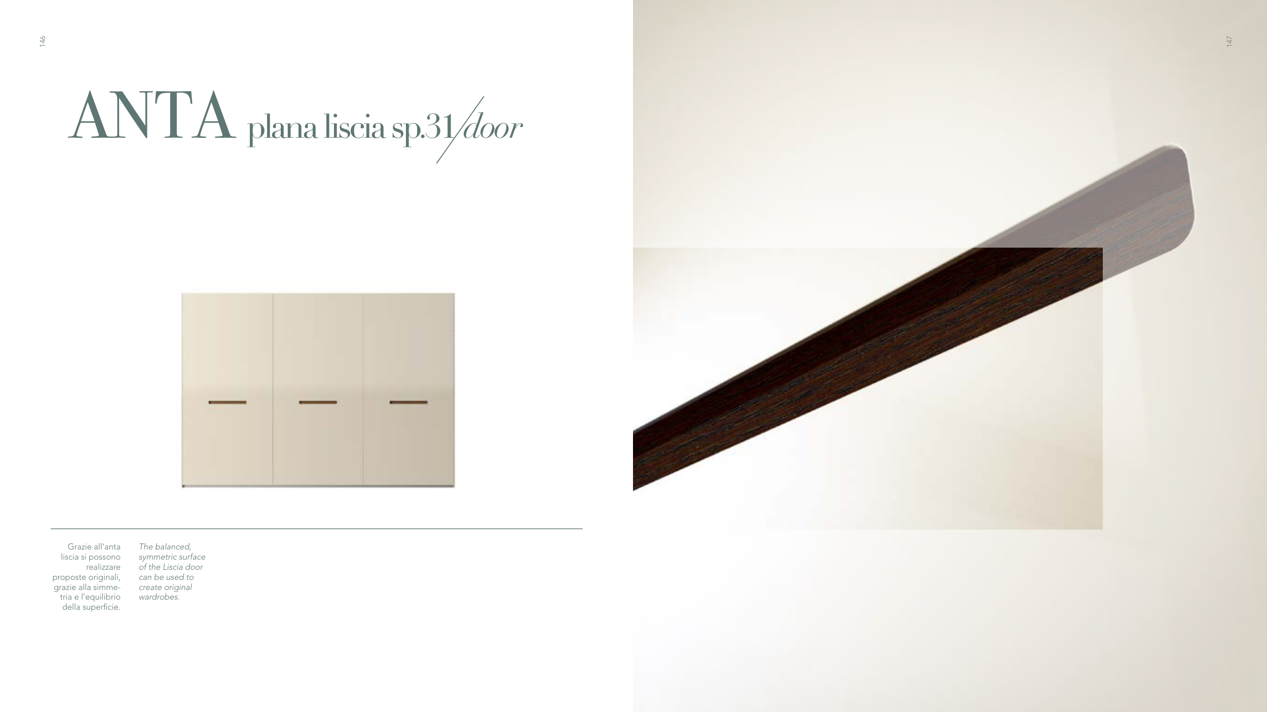 147 146 Grazie all’anta liscia si possono realizzare proposte originali, grazie alla simme- tria e l’equilibrio della superficie. The balanced, symmetric surface of the Liscia door can be used to create original wardrobes. ANTA plana liscia sp.31 door
