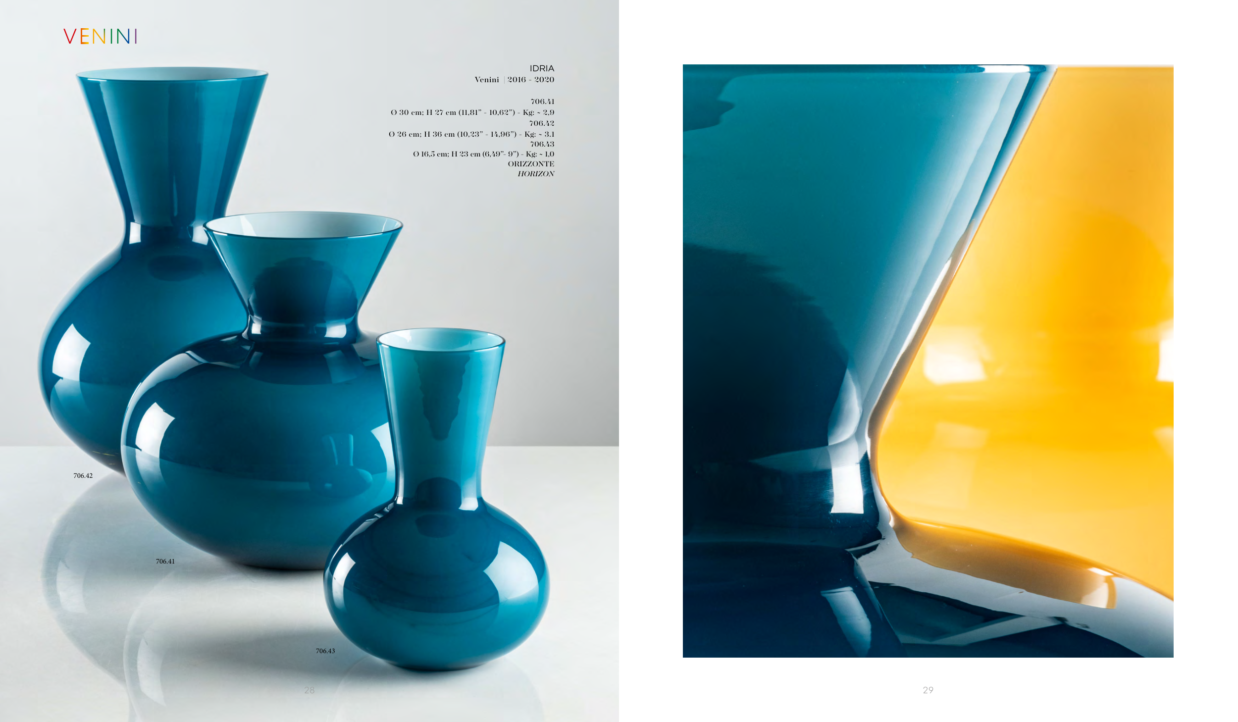 29 A r t G L A s s | i C o n e IDRIA Venini | 2016 - 2020 706.41 Ø 30 cm; H 27 cm (11,81” - 10,62”) - Kg: ~ 2,9 706.42 Ø 26 cm; H 36 cm (10,23” - 14,96”) - Kg: ~ 3.1 706.43 Ø 16,5 cm; H 23 cm (6,49”- 9”) - Kg: ~ 1,0 ORIZZONTE HORIZON 28 706.42 706.41 706.43