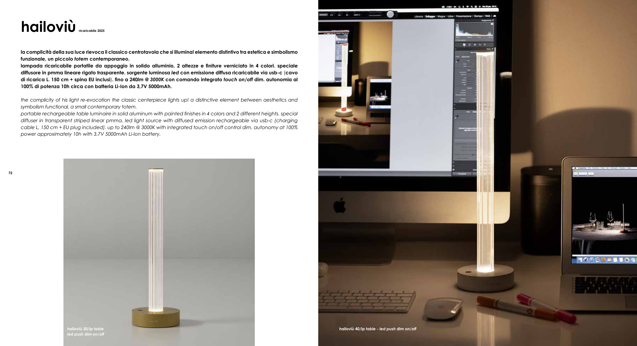 cable L. 150 cm + EU plug included). up to 240lm @ 3000K with integrated touch on/off control dim. autonomy at 100%
