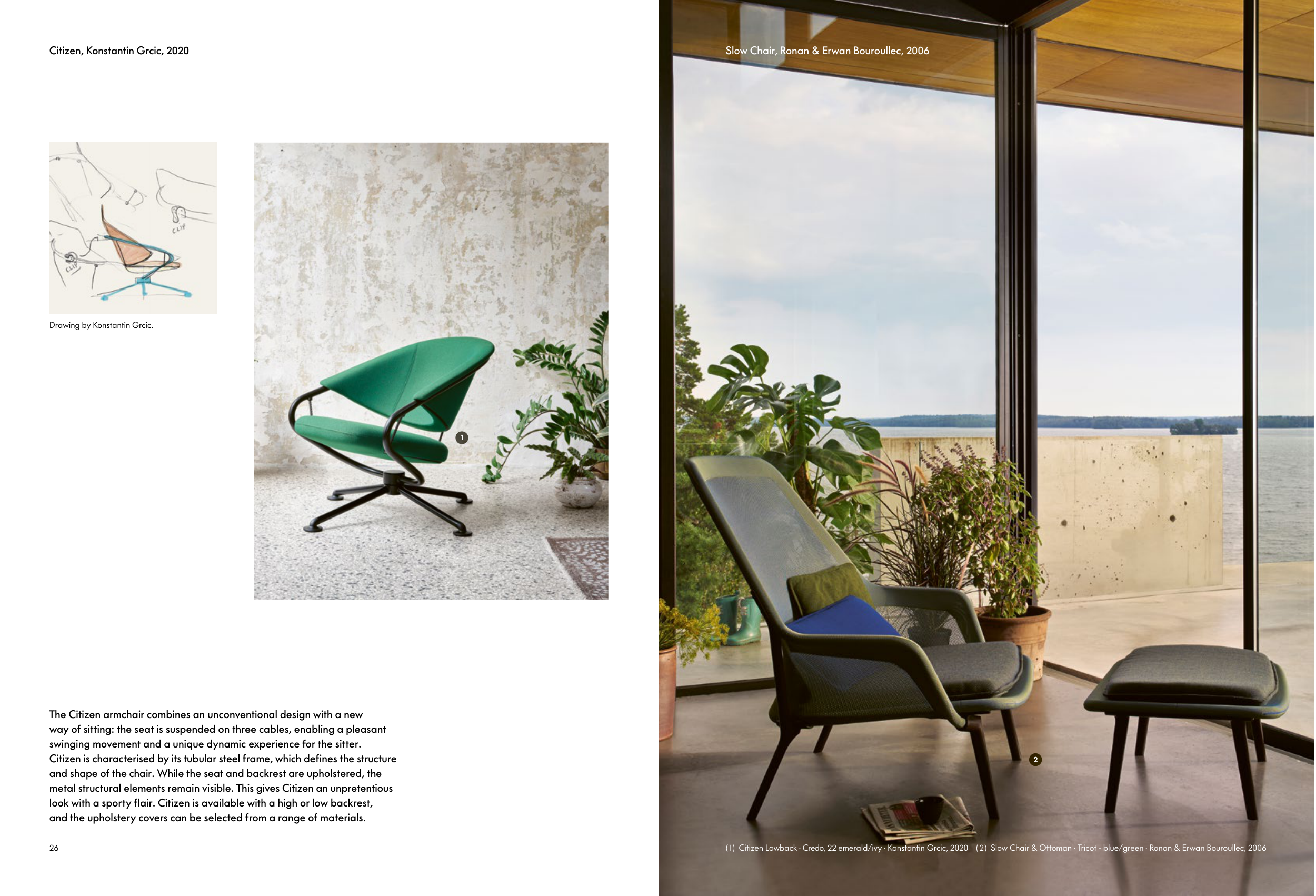 ( 1 ) Citizen Lowback · Credo , 22 emerald/ivy · Konstantin Grcic , 2020 ( 2 ) Slow Chair & Ottoman · Tricot - blue/green · Ronan & Erwan Bouroullec , 2006
