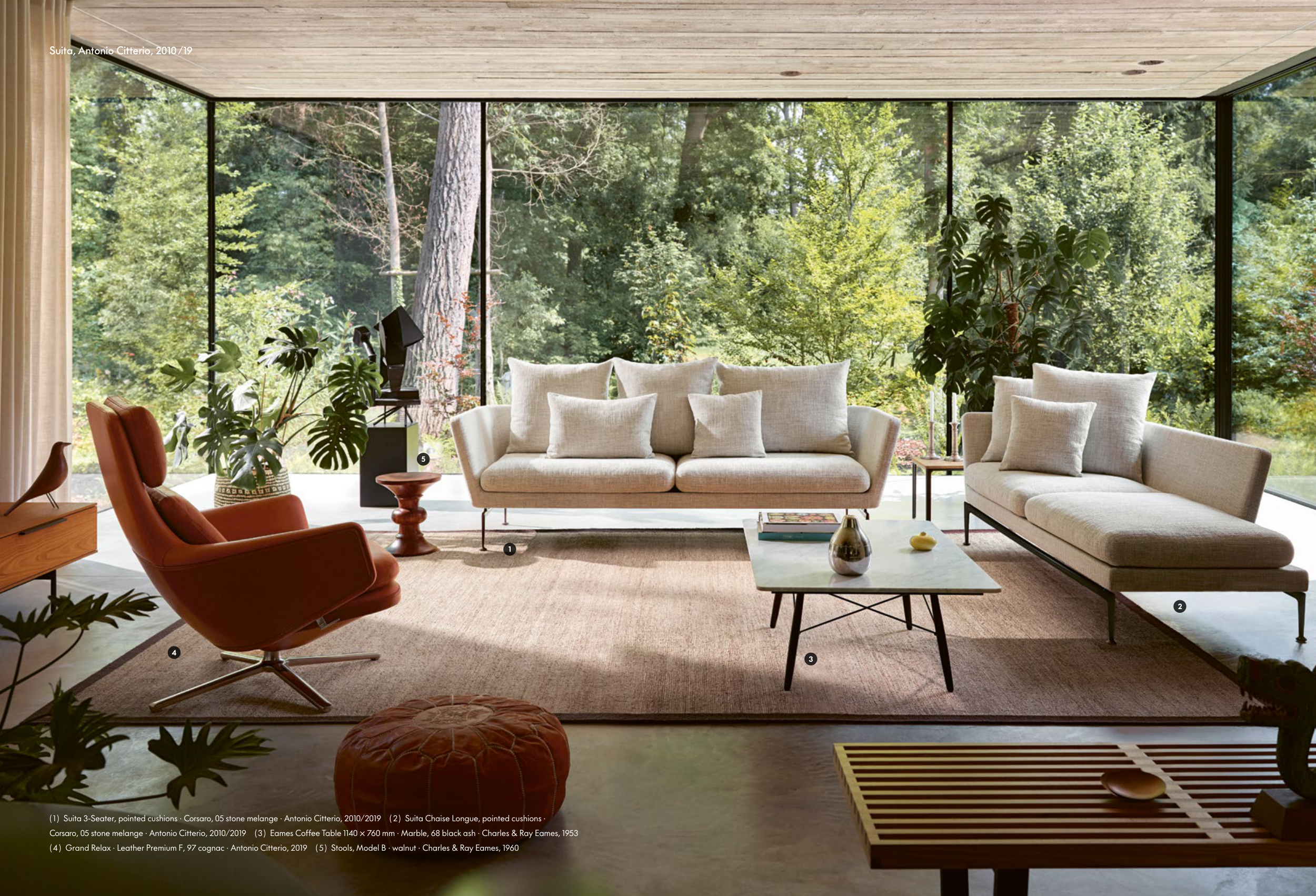 Corsaro, 05 stone melange · Antonio Citterio, 2010/2019 ( 3 ) Eames Coffee Table 1140 × 760 mm · Marble , 68 black ash · Charles & Ray Eames, 1953