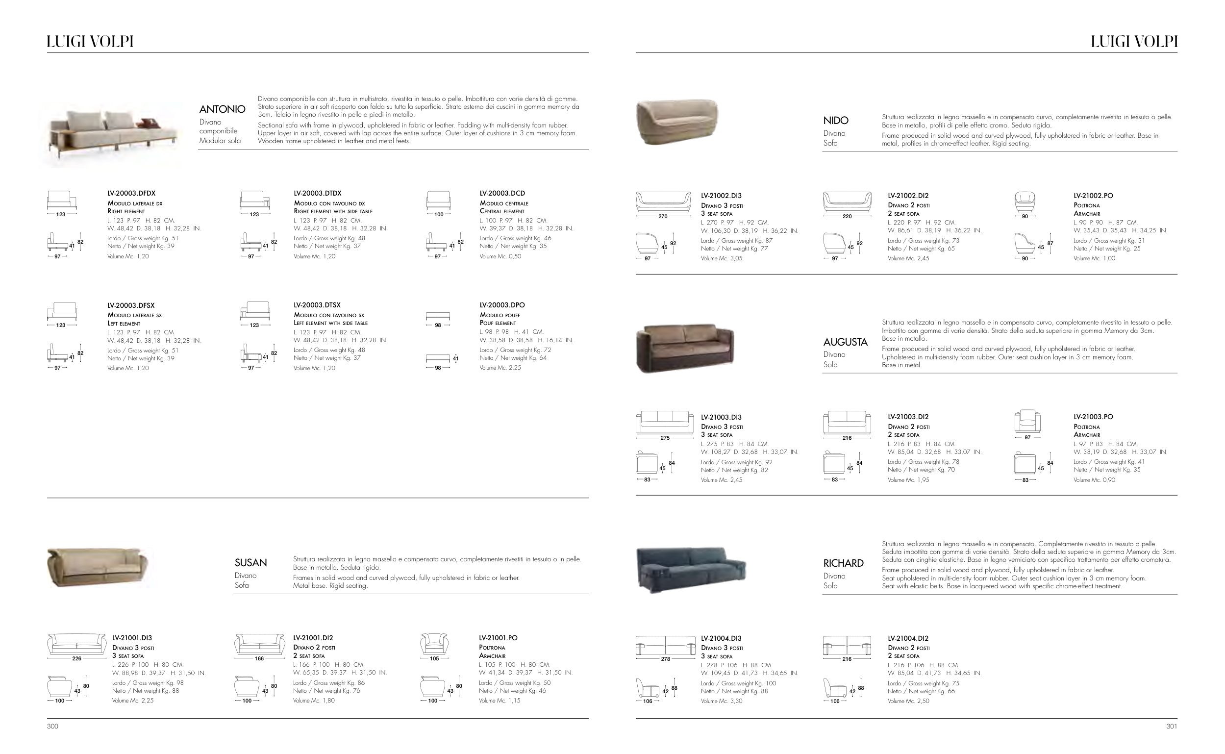 Frames in solid wood and curved plywood, fully upholstered in fabric or leather.