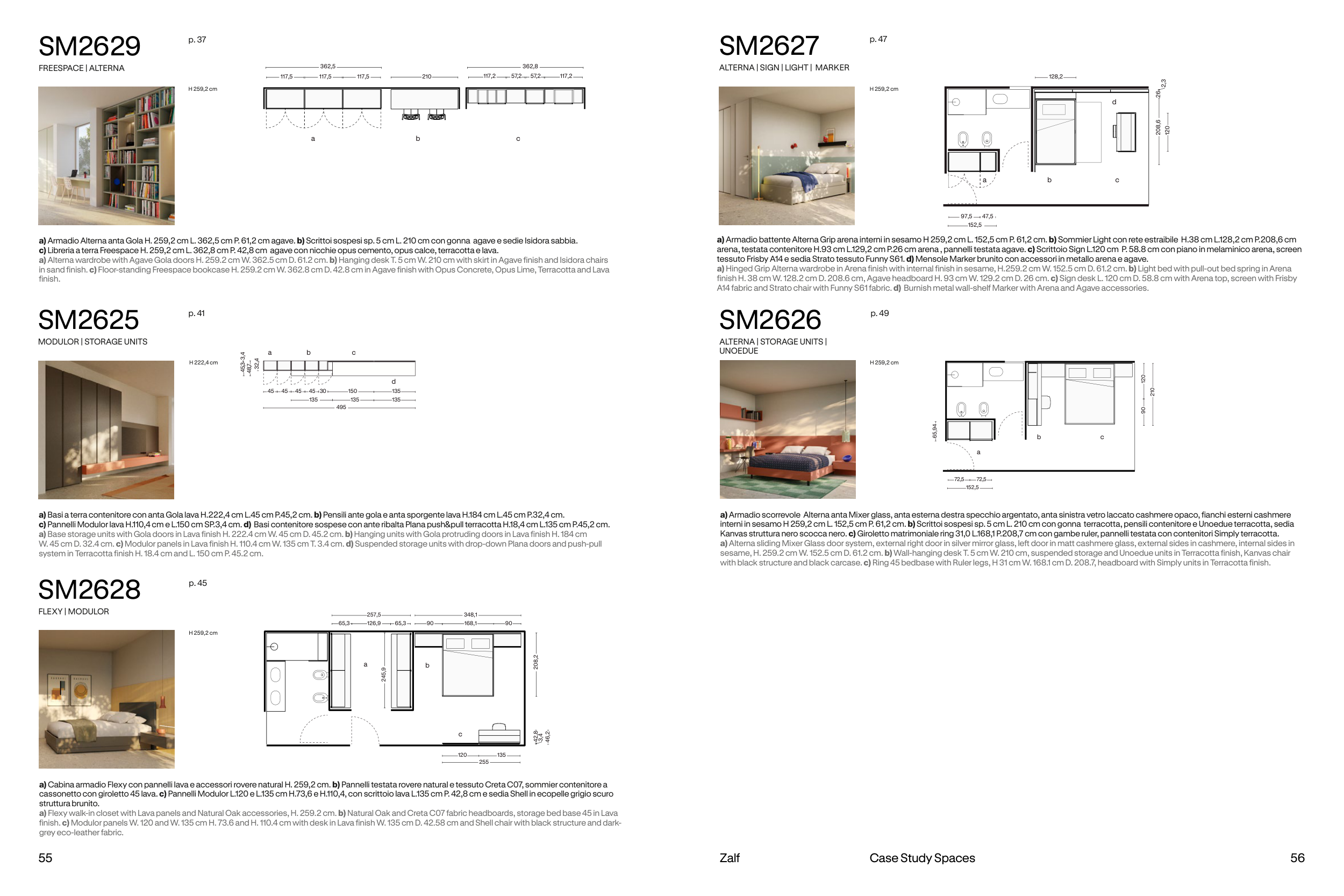 a) Flexy walk-in closet with Lava panels and Natural Oak accessories, H. 259.2 cm. b) Natural Oak and Creta C07 fabric headboards, storage bed base 45 in Lava