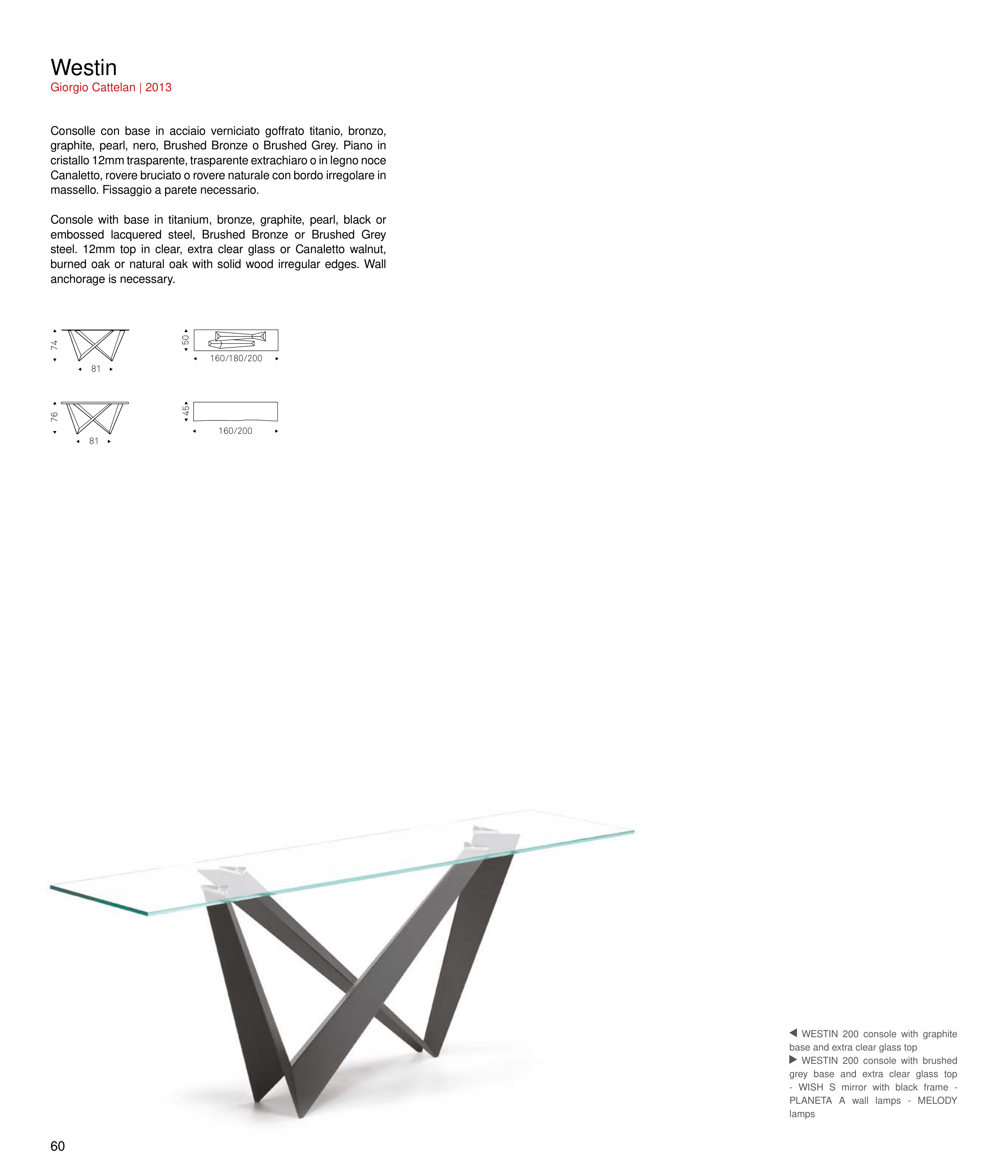 steel. 12mm top in clear, extra clear glass or Canaletto walnut,