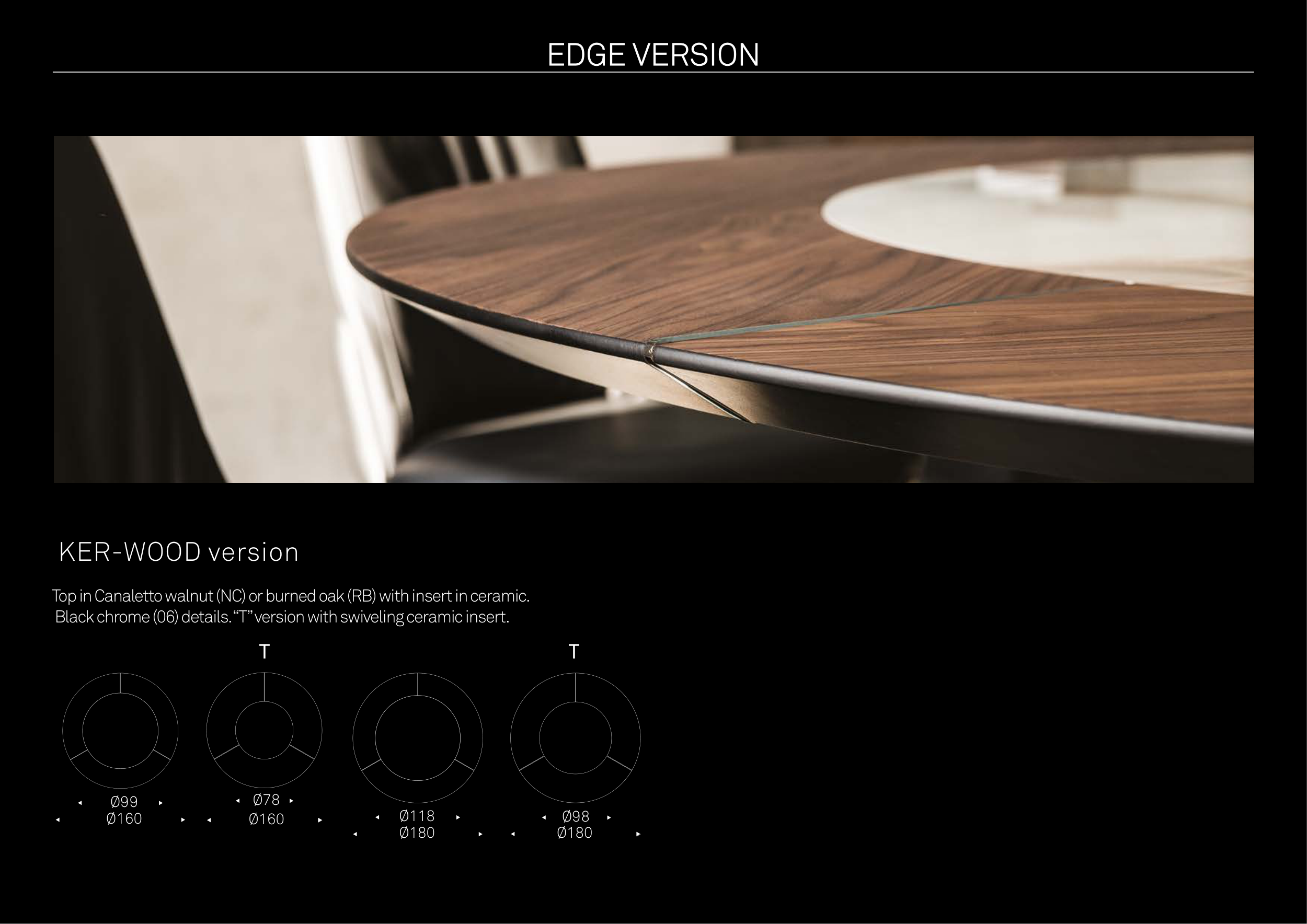 Top in Canaletto walnut (NC) or burned oak (RB) with insert in ceramic.