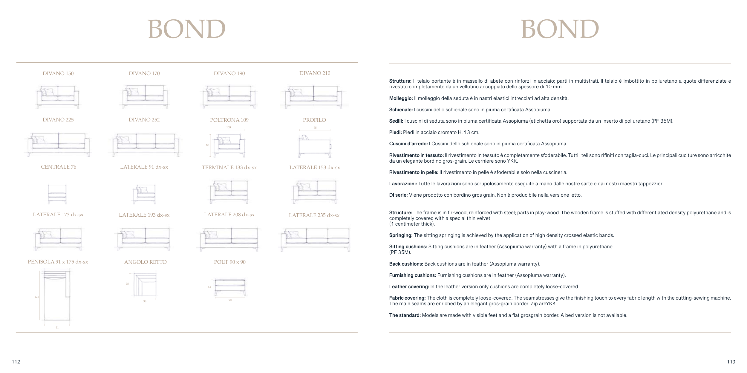 Sedili: I cuscini di seduta sono in piuma certificata Assopiuma (etichetta oro) supportata da un inserto di poliuretano (PF 35M).