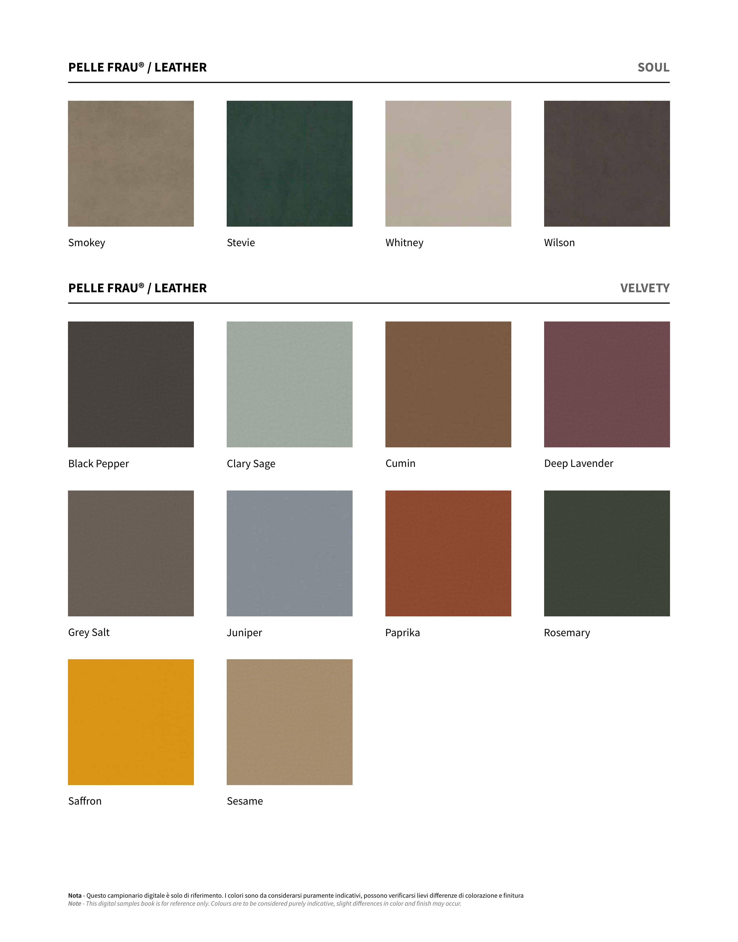 Nota - Questo campionario digitale è solo di riferimento. I colori sono da considerarsi puramente indicativi, possono verificarsi lievi differenze di colorazione e finitura