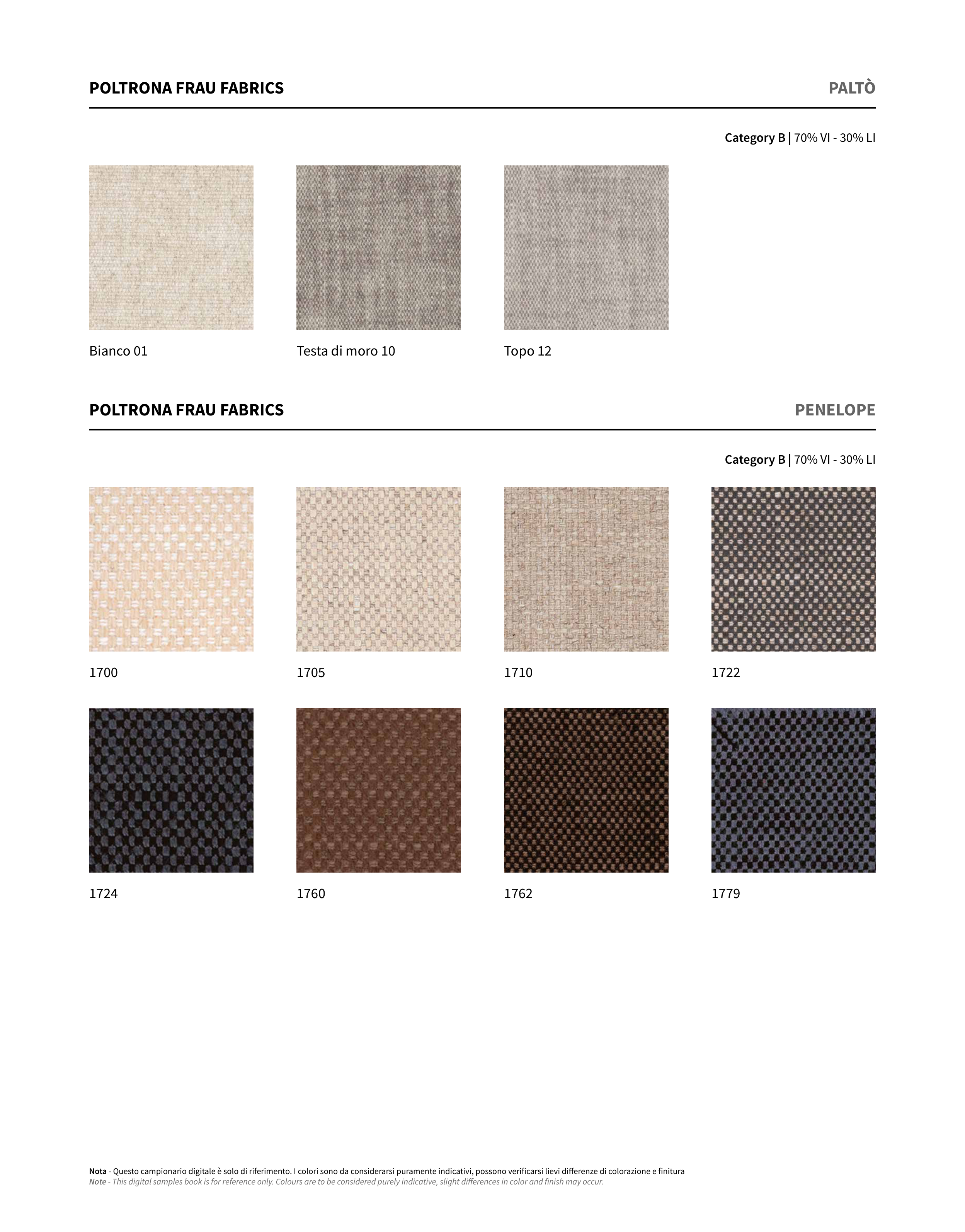 Nota - Questo campionario digitale è solo di riferimento. I colori sono da considerarsi puramente indicativi, possono verificarsi lievi differenze di colorazione e finitura