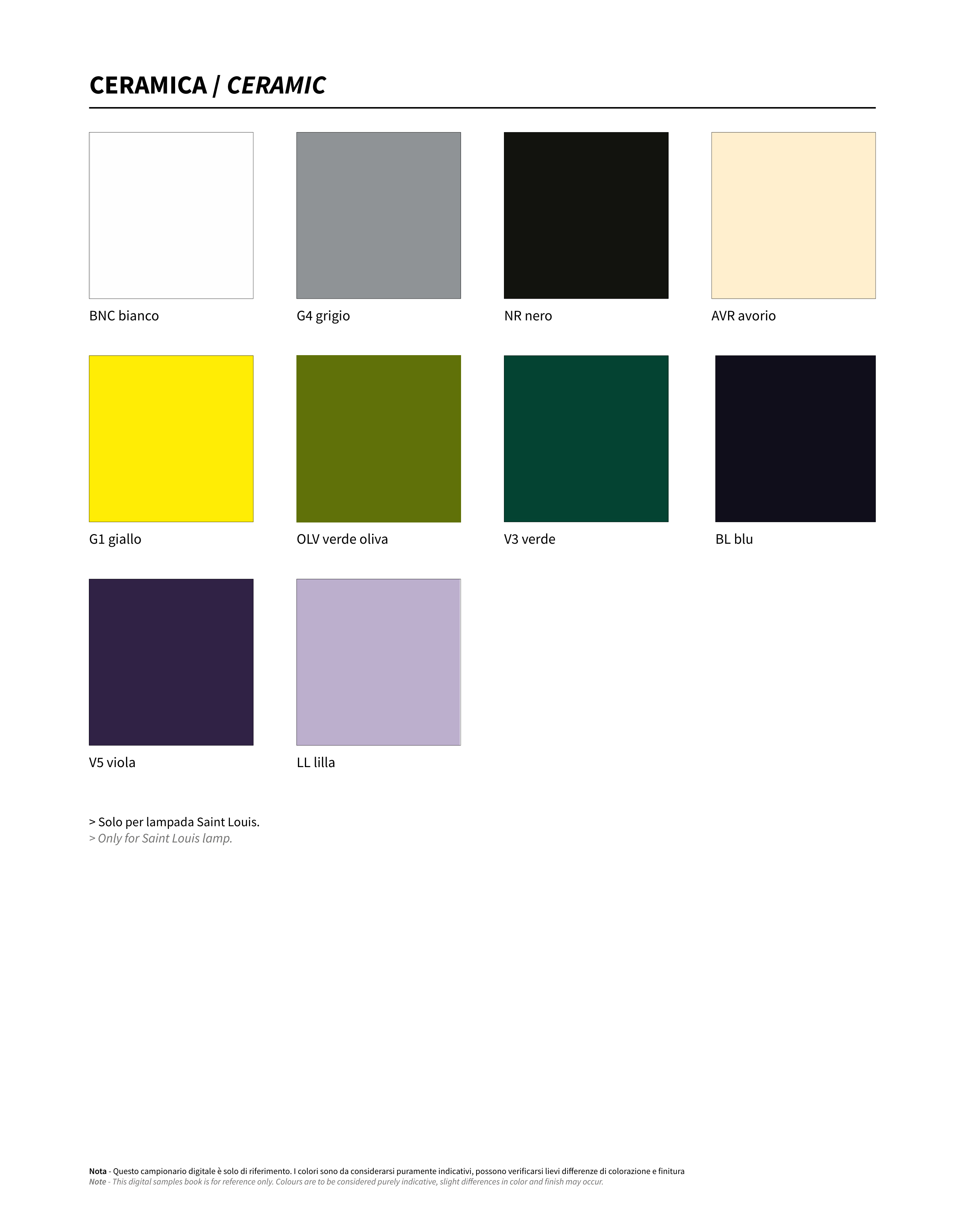 Nota - Questo campionario digitale è solo di riferimento. I colori sono da considerarsi puramente indicativi, possono verificarsi lievi differenze di colorazione e finitura