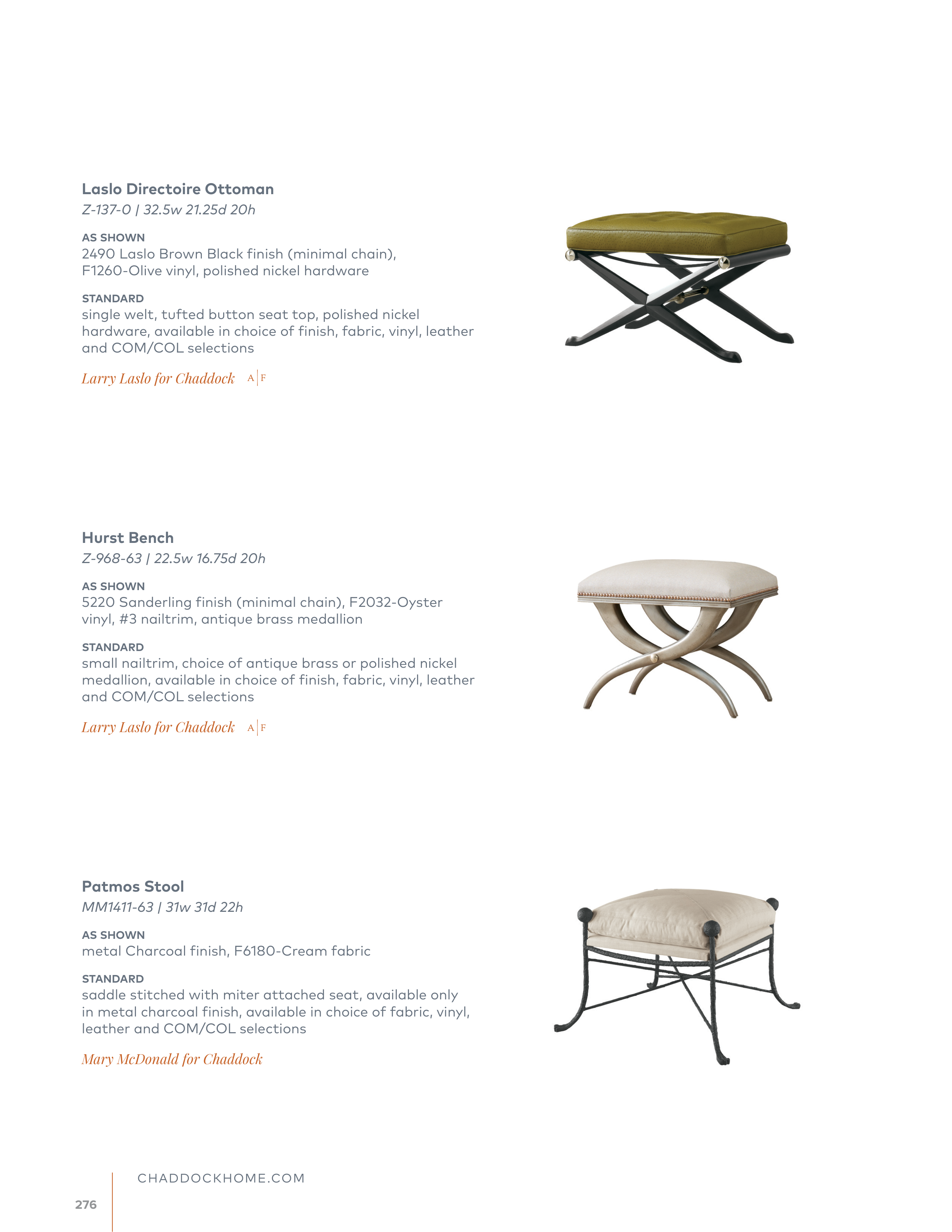 hardware, available in choice of finish, fabric, vinyl, leather