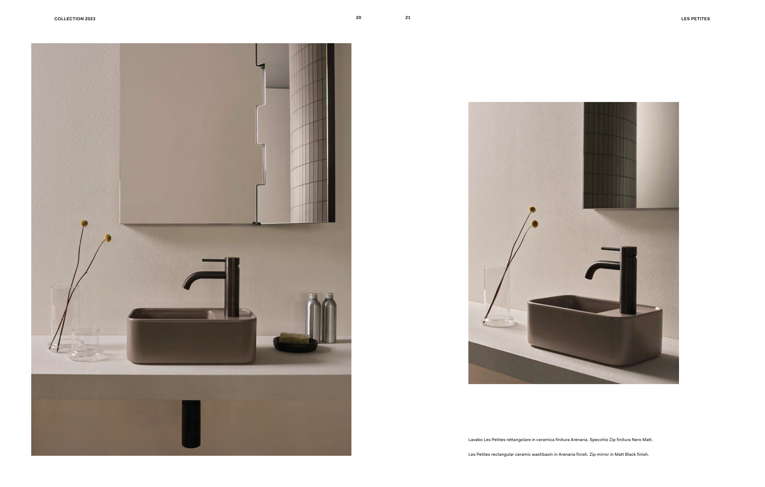 Lavabo Les Petites rettangolare in ceramica finitura Arenaria. Specchio Zip finitura Nero Matt.
