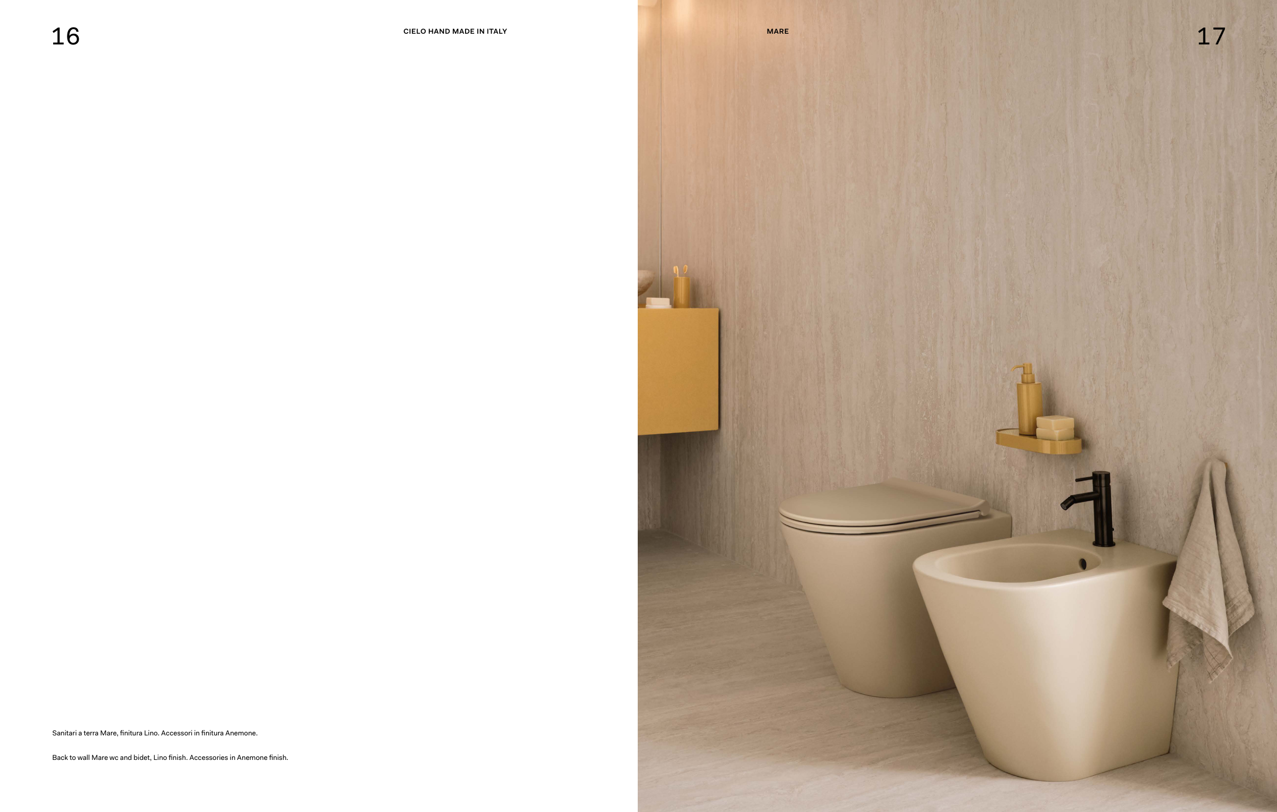 Back to wall Mare wc and bidet, Lino finish. Accessories in Anemone finish.