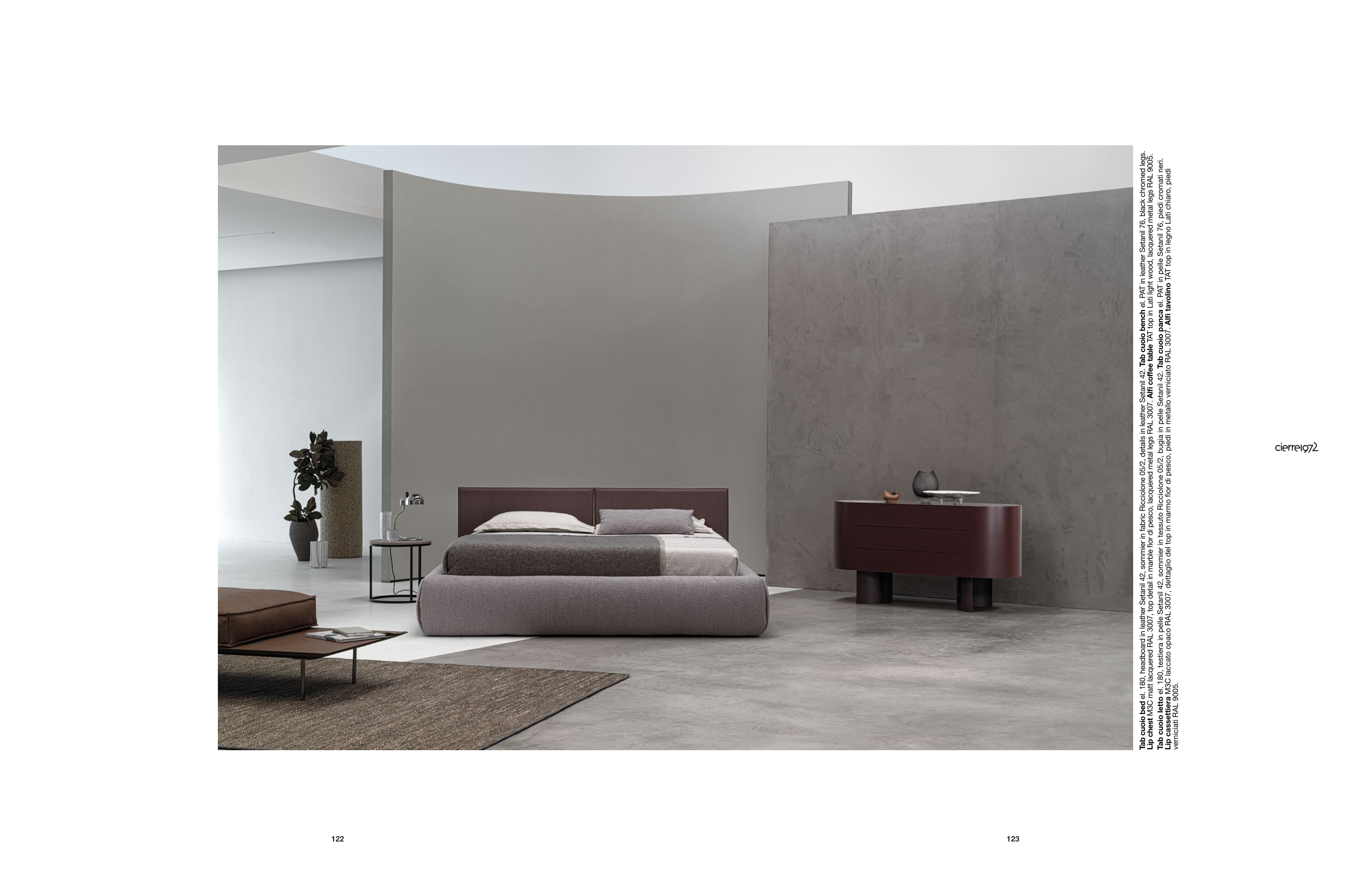 Tab cuoio letto el. 180, testiera in pelle Setanil 42, sommier in tessuto Ricciolone 05/2, bugia in pelle Setanil 42. Tab cuoio panca el. PAT in pelle Setanil 76, piedi cromati neri.