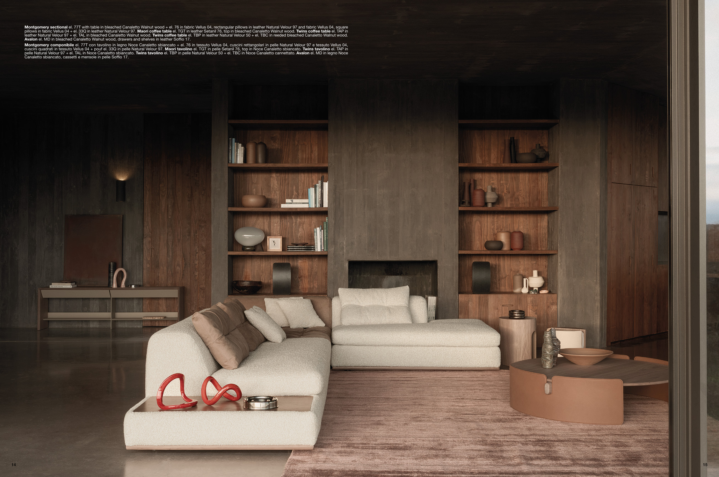 pelle Natural Velour 97 + el. TAL in Noce Canaletto sbiancato. Twins tavolino el. TBP in pelle Natural Velour 50 + el. TBC in Noce Canaletto cannettato. Avalon el. MD in legno Noce