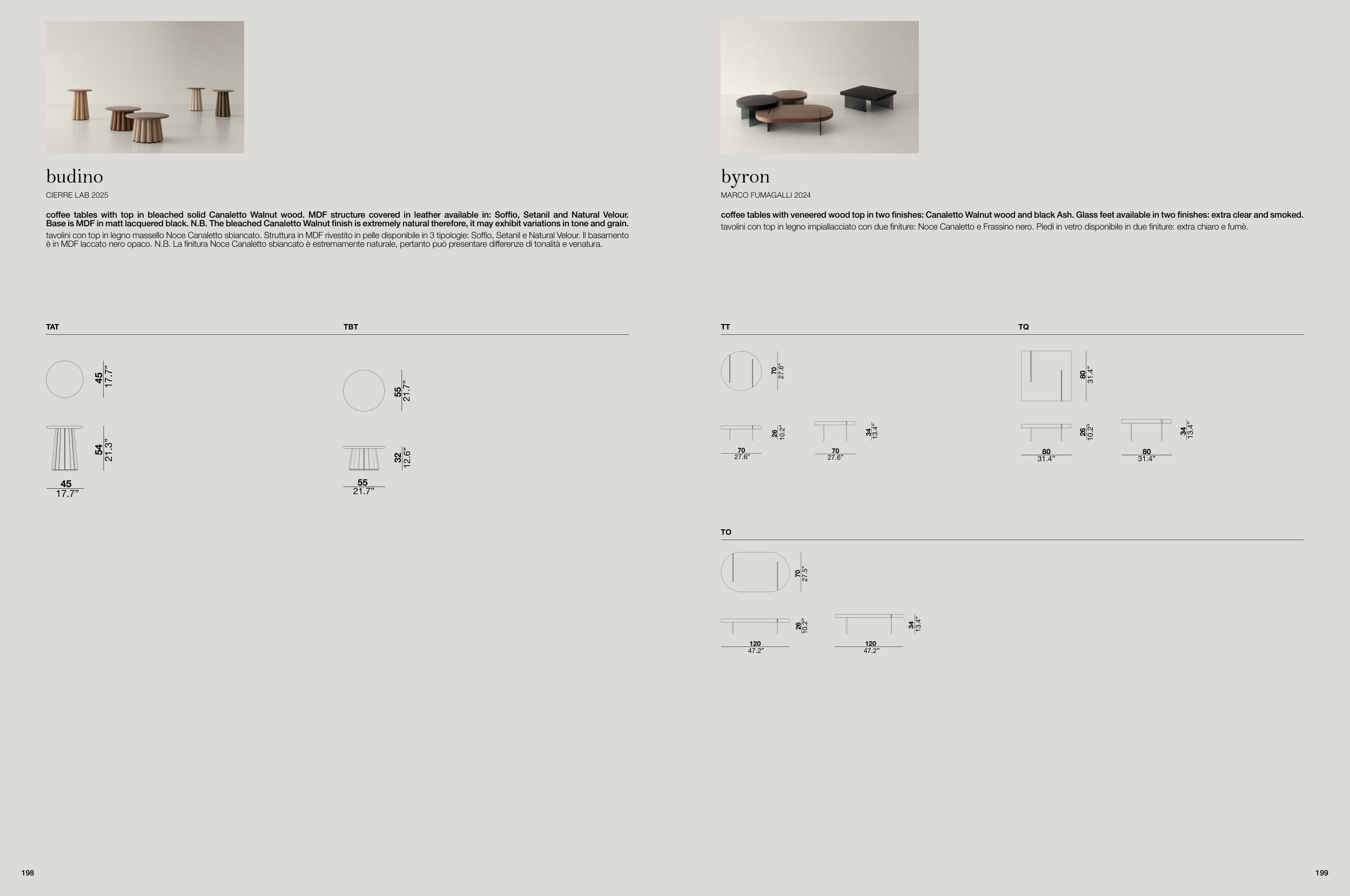 coffee tables with top in bleached solid Canaletto Walnut wood. MDF structure covered in leather available in: Soffio, Setanil and Natural Velour.