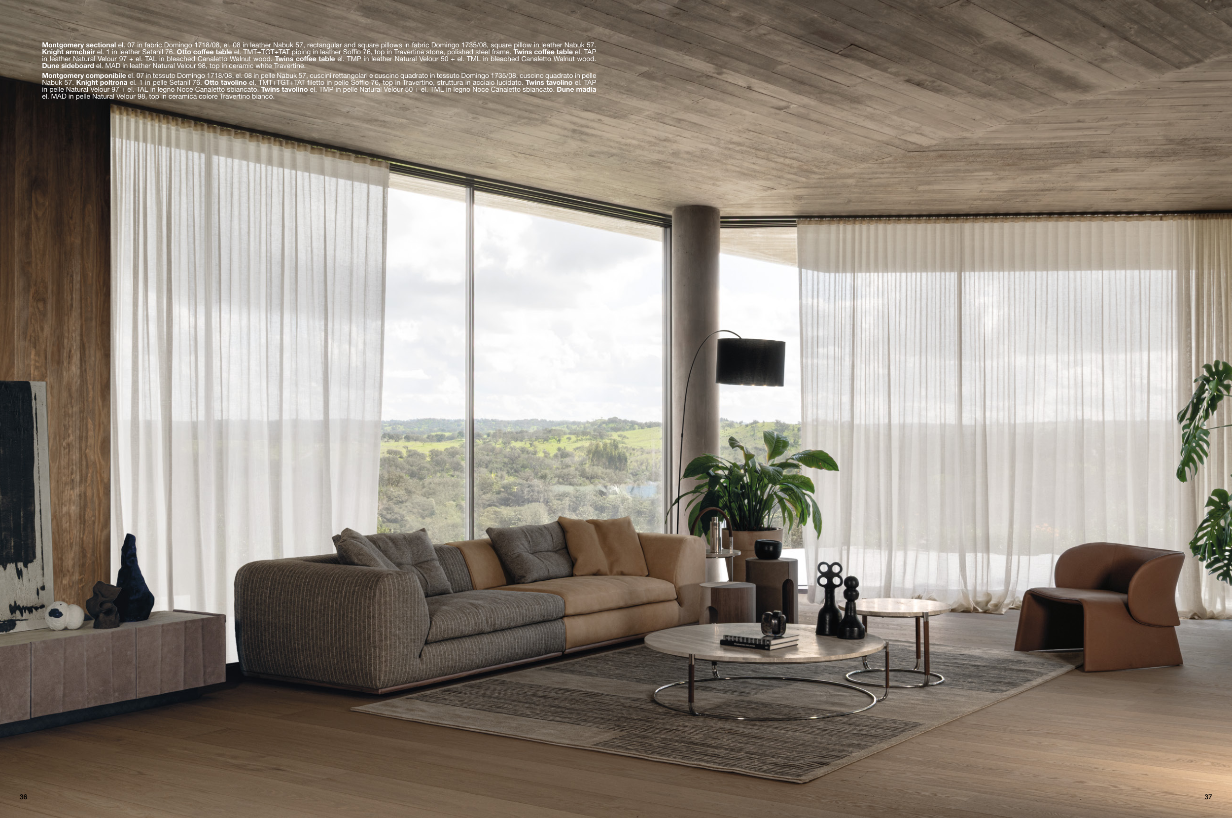in leather Natural Velour 97 + el. TAL in bleached Canaletto Walnut wood. Twins coffee table el. TMP in leather Natural Velour 50 + el. TML in bleached Canaletto Walnut wood.