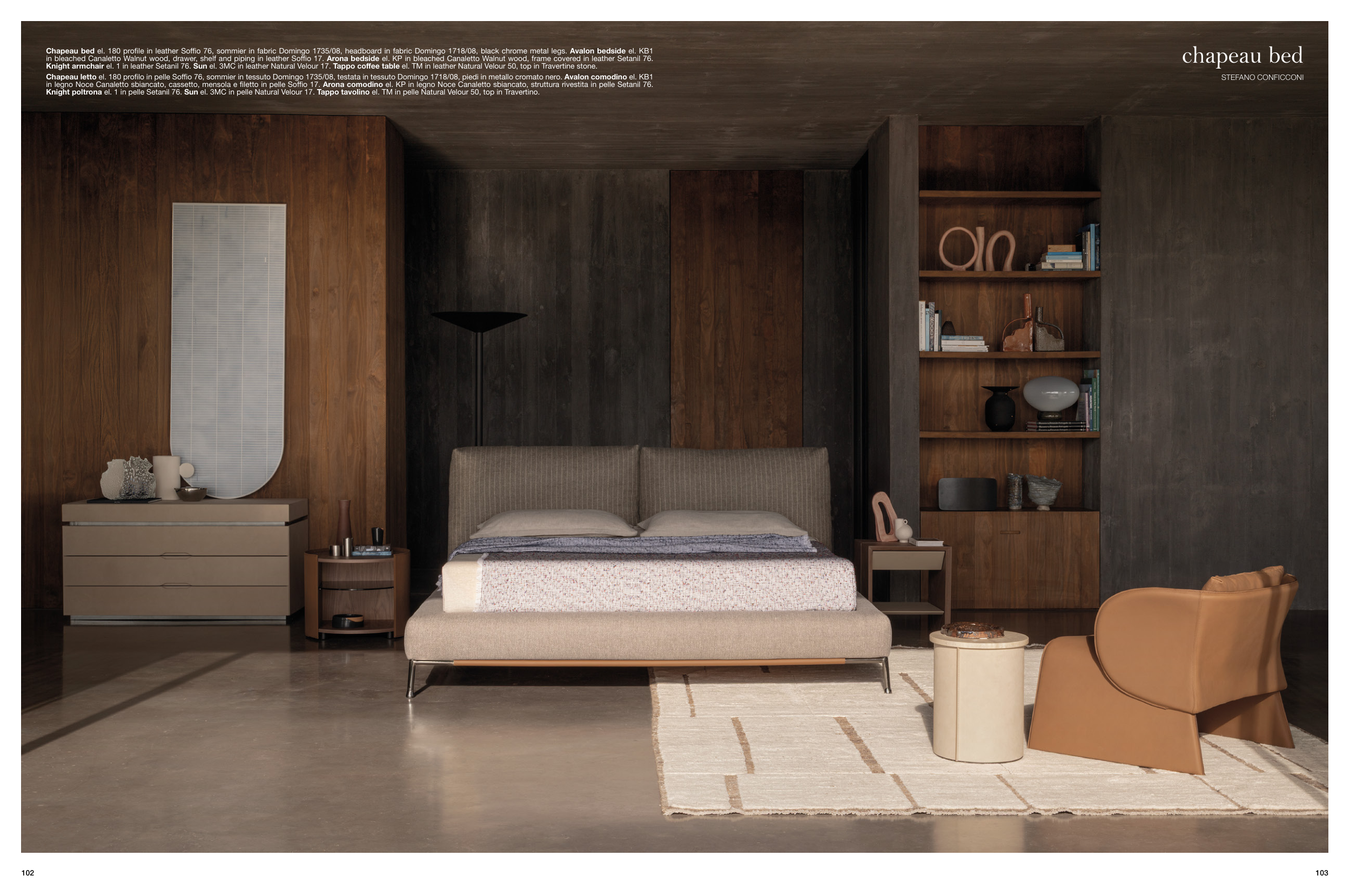Chapeau letto el. 180 profilo in pelle Soffio 76, sommier in tessuto Domingo 1735/08, testata in tessuto Domingo 1718/08, piedi in metallo cromato nero. Avalon comodino el. KB1
