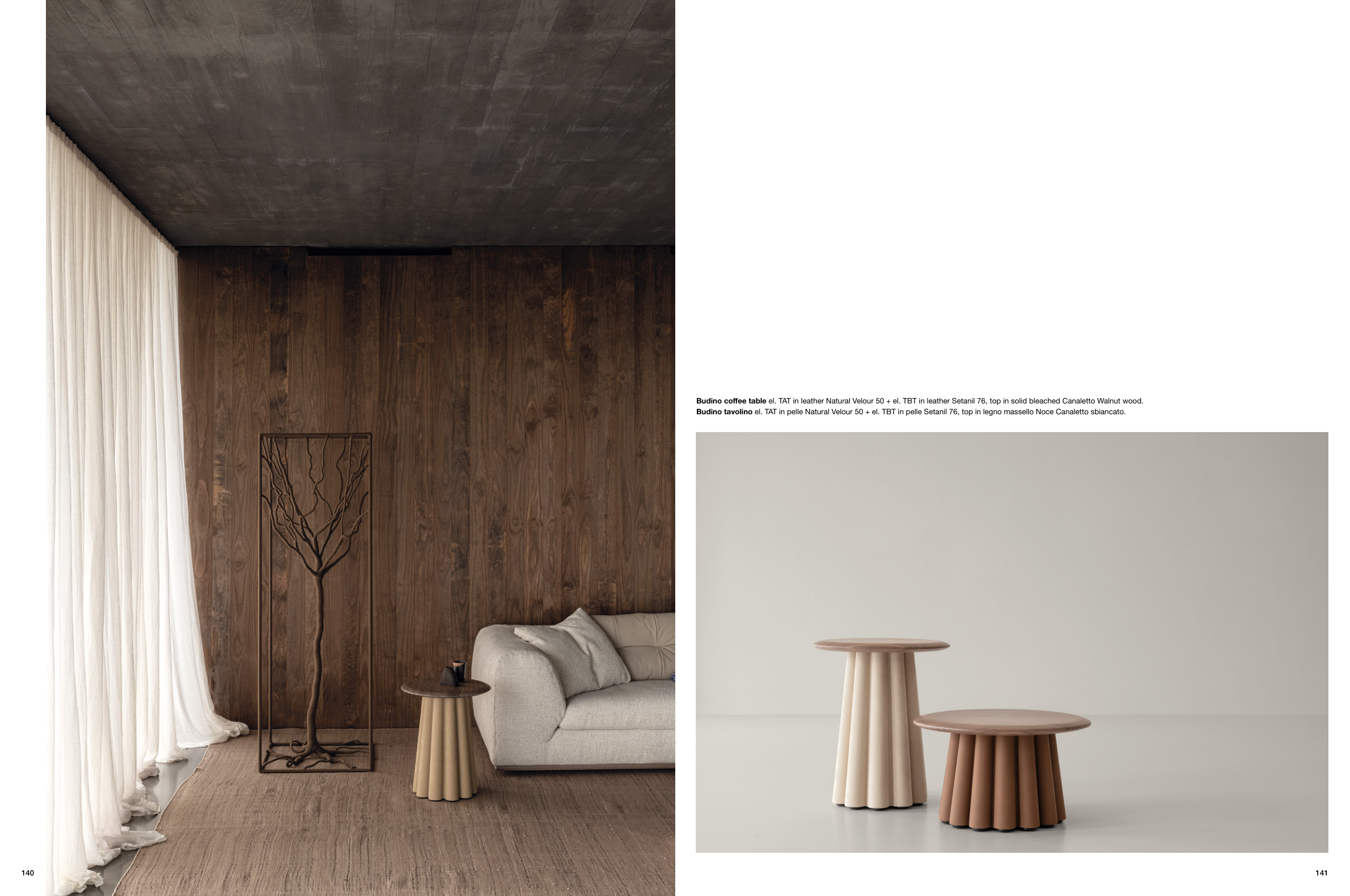 Budino coffee table el. TAT in leather Natural Velour 50 + el. TBT in leather Setanil 76, top in solid bleached Canaletto Walnut wood.