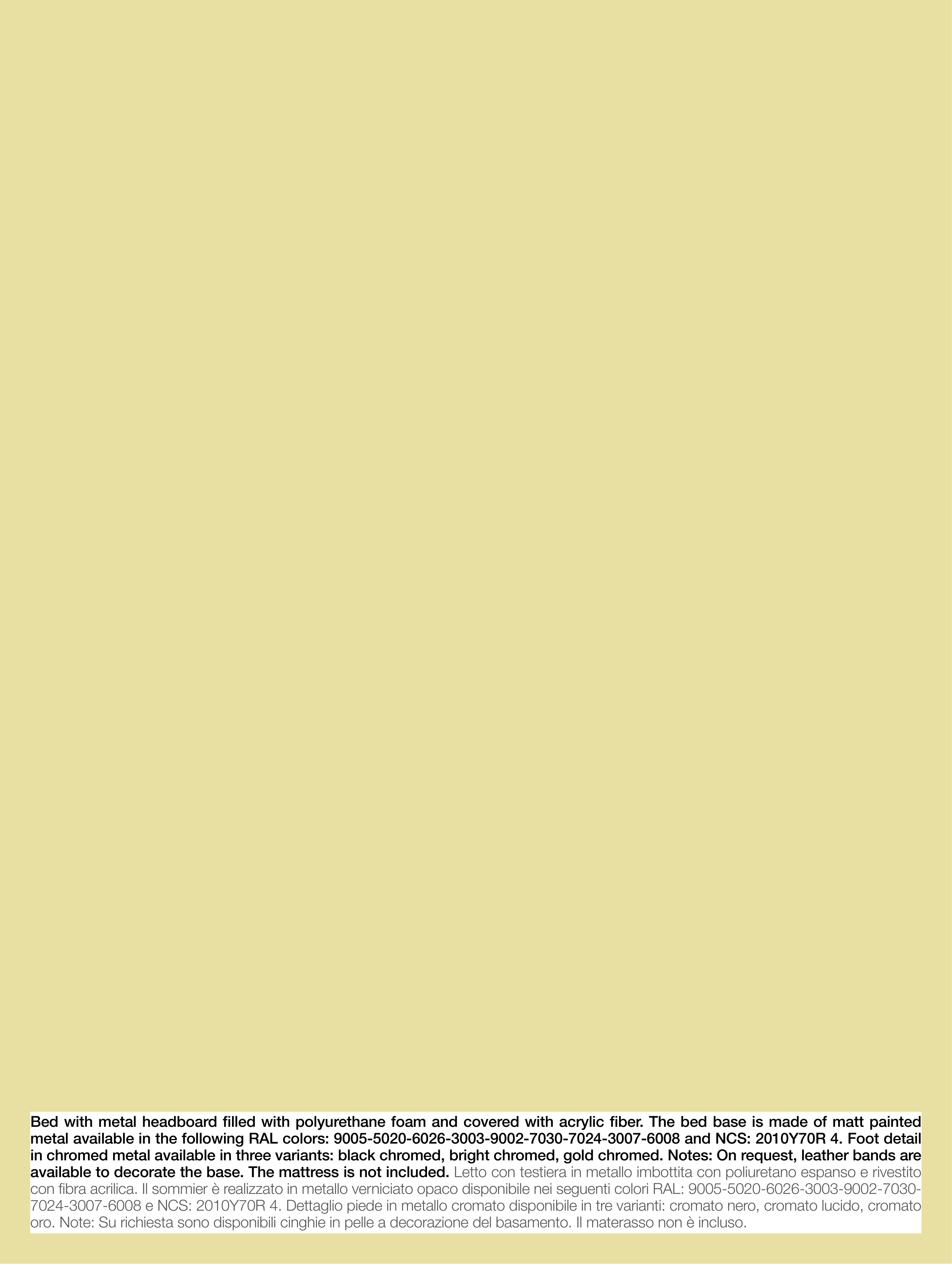 oro. Note: Su richiesta sono disponibili cinghie in pelle a decorazione del basamento. Il materasso non è incluso.