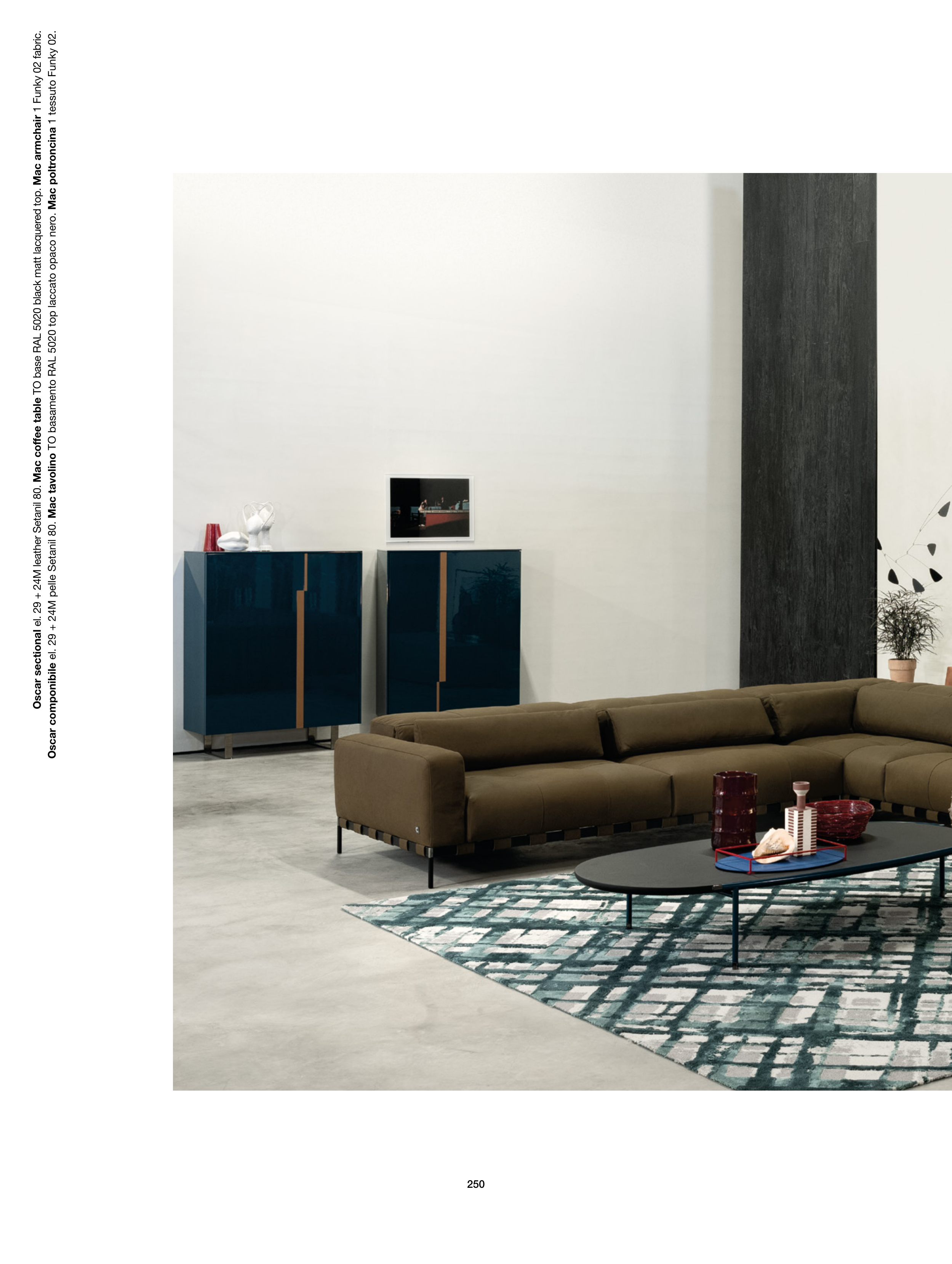 Oscar sectional el. 29 + 24M leather Setanil 80. Mac coffee table TO base RAL 5020 black matt lacquered top. Mac armchair 1 Funky 02 fabric.