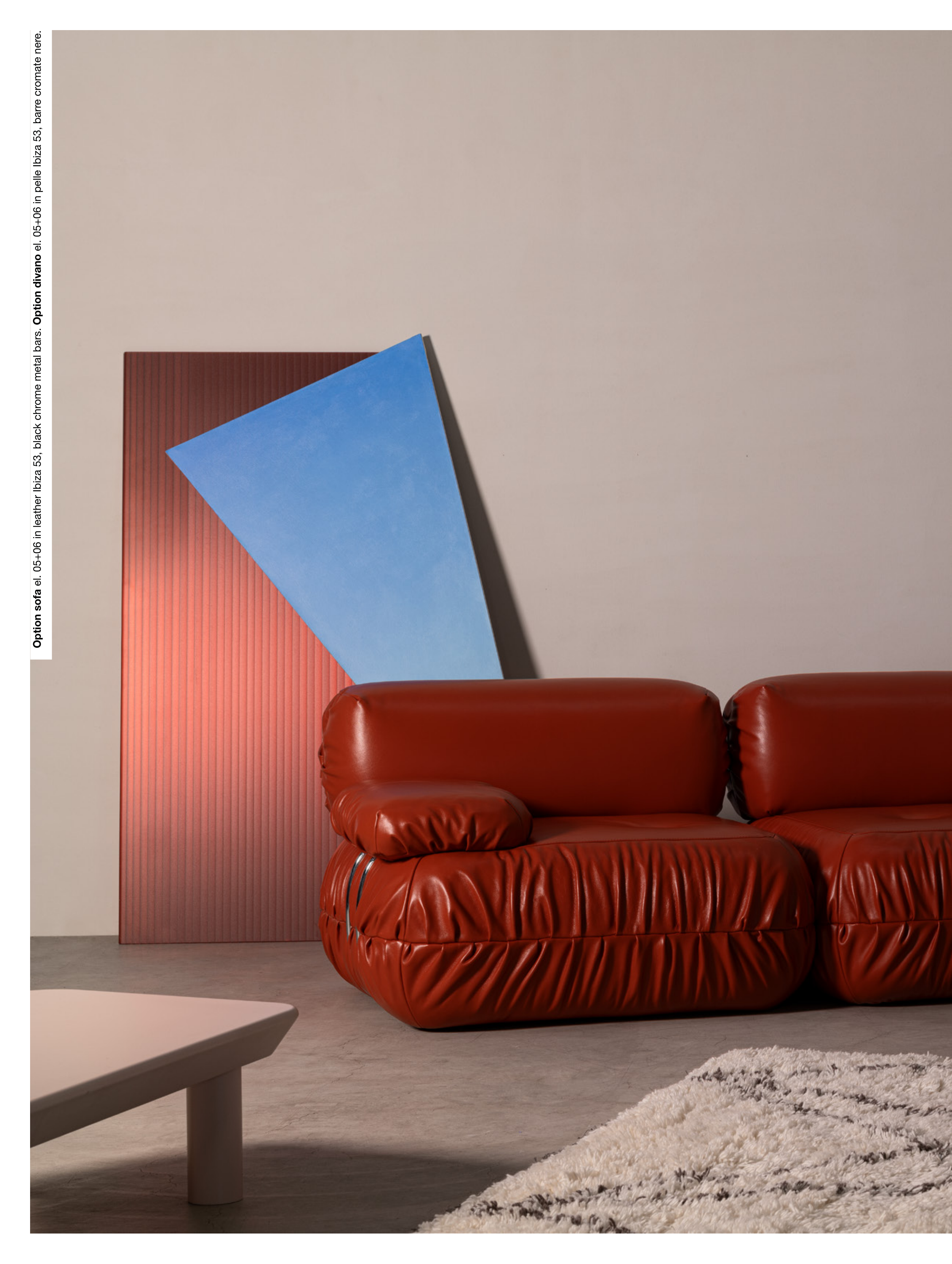 Option sofa el. 05+06 in leather Ibiza 53, black chrome metal bars. Option divano el. 05+06 in pelle Ibiza 53, barre cromate nere.